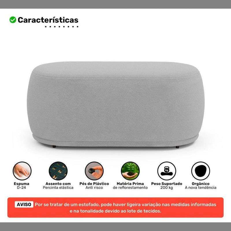 Kit 02 Puffs Decorativos Orgânicos Molly 02 Lugares Bouclê Cinza Claro - Desk DesignKit 02 Puffs Decorativos Orgânicos Molly 02 Lugares - Estilo, conforto e funcionalidade para qualquer ambiente!O Puff Living Molly é a escolha ideal para quem busca um puff decorativo com design orgânico e moderno, aliado ao conforto e excelente custo-benefício. Seu formato clean e estrutura versátil se adaptam perfeitamente a salas de estar, living, recepções e ambientes corporativos.Com capacidade para até 2 pessoas, o modelo é produzido com estrutura em madeira de eucalipto, espuma D-24 e percintas elásticas no assento, garantindo maior conforto e durabilidade. As sapatas plásticas protegem o piso e facilitam o uso diário.- Capacidade para até 2 lugares: Ideal para quem busca funcionalidade sem abrir mão do design- Excelente custo-benefício: Alta qualidade, conforto e resistência em um único móvel- Estrutura em madeira de eucalipto: Robustez que garante segurança e longa vida útil- Percintas elásticas no assento: Mais sustentação e conforto ao sentarAdicione o Puff Orgânico Living Molly 02 Lugares ao seu espaço e desfrute de versatilidade com charme contemporâneo!Dimensões Aproximadas do Produto:Largura: 106 cmAltura: 42 cmProfundidade: 58 cmAltura dos Pés: 2 cmPeso Aproximado: 18 kgATENÇÃO:** PODE HAVER UMA PEQUENA VARIAÇÃO DE COR ENTRE O PRODUTO REAL E A IMAGEM ANUNCIADA DEVIDO AO LOTE DE TECIDOS.** POR SE TRATAR DE UM ESTOFADO, AS MEDIDAS PODEM SOFRER UMA VARIAÇÃO DE ATÉ 3 CM.** PRODUTO ENVIADO MONTADO. VERIFIQUE AS DIMENSÕES E ASSEGURE-SE DE QUE O ITEM PASSARÁ POR ELEVADORES, PORTAS, ESCADAS OU CORREDORES DA SUA RESIDÊNCIA.Características:Material da Estrutura: Madeira de EucaliptoMaterial do Estofamento: Espuma D-24Revestimento: BouclêPossui Pés: SimTipo de Pés: FixosMaterial dos Pés: PlásticoNúmero de Lugares: 2Peso Suportado: 200 kg Sem ImpactoAmbiente Principal: Sala de Estar, Recepção, Consultório, LivingTipo de Produto: Puff Redondo, Puff OrgânicoPossui Manual de Montagem: NãoDiferenciais:- Espuma D-24- Sapatas Plásticas Fixas- Design Orgânico- Percintas Elásticas no AssentoItens Inclusos:- 02 PuffsMontagem:- Complexidade da Montagem: Baixa.- Recomendamos que seja feita por um profissional qualificado.- Produto enviado montado.Garantia de Fábrica:90 dias contra defeito de fabricação.Limpeza e cuidados: Utilizar pano levemente umedecido com água, seguido de pano seco. Não utilizar produtos químicos ou abrasivos na limpeza. Evitar contato com objetos cortantes. Manter ao abrigo de local interno, sem ficar exposto diretamente ao sol, calor e umidade excessivo.Importante:- Pode haver ligeira diferença de tonalidade entre a imagem digital e o produto real por conta do tratamento de imagens e a calibração de cores do seu monitor.- As imagens são meramente ilustrativas, não acompanham objetos de decoração e eletrônicos.- Produto para uso residencial em ambiente interno, não devendo ficar exposto diretamente ao sol, calor e umidades excessivas.- Ao receber a mercadoria verifique a condição da embalagem, caso apresente violação ou esteja danificada não assine o comprovante de entrega.- Montagem, desmontagem e outras instalações é de inteira responsabilidade do cliente.- Caso resida em apartamento ou condomínio é indispensável que confira as dimensões do produto e certifique-se de que passará normalmente por elevadores, portas, escadas e/ou corredores de sua residência. Não nos responsabilizamos no ato da entrega, por subir escadas/elevadores ou pelo transporte por guincho em apartamentos. Eventuais despesas são de responsabilidade do comprador.