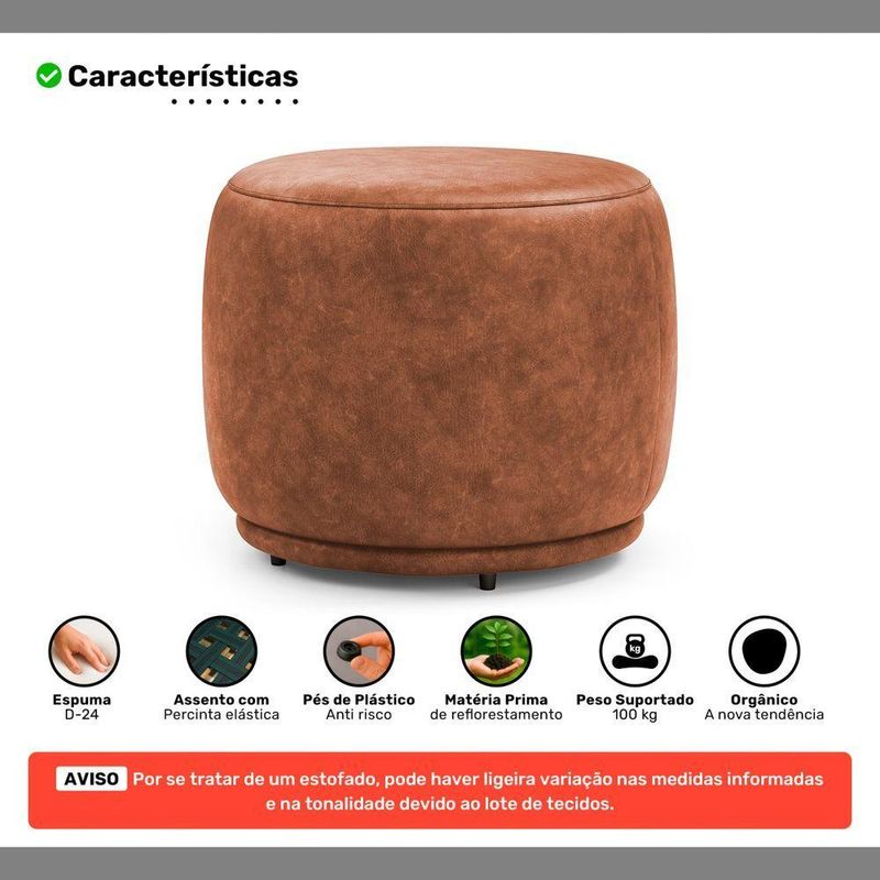 Kit 02 Puffs Decorativos Orgânicos Molly Redondo Couríssimo Caramelo - Desk Design Cor CarameloKit 02 Puffs Decorativos Orgânicos Molly - Um toque moderno e versátil para sua decoração!O Puff Living Molly é a escolha perfeita para quem deseja um puff decorativo com design orgânico e minimalista. Seu formato redondo e acabamento elegante o tornam ideal para compor ambientes como sala de estar, living, recepção ou espaços corporativos.Fabricado com estrutura em madeira de eucalipto e espuma D-24, oferece conforto e durabilidade no dia a dia. As sapatas plásticas protegem o piso e garantem estabilidade ao uso.- Design moderno e orgânico: Estética contemporânea que valoriza qualquer ambiente com leveza e sofisticação- Excelente custo-benefício: Alta qualidade em estrutura e acabamento por um valor acessível- Estrutura em madeira de eucalipto: Robustez e resistência para uso frequente- Percintas elásticas no assento: Mais conforto e sustentação em um móvel compacto e funcionalTransforme seu espaço com o Puff Orgânico Living Molly e adicione charme com funcionalidade!Dimensões Aproximadas do Produto:Largura: 56 cmAltura: 42 cmProfundidade: 56 cmAltura dos Pés: 2 cmPeso Aproximado: 8 kgATENÇÃO:** PODE HAVER UMA PEQUENA VARIAÇÃO DE COR ENTRE O PRODUTO REAL E A IMAGEM ANUNCIADA DEVIDO AO LOTE DE TECIDOS.** POR SE TRATAR DE UM ESTOFADO, AS MEDIDAS PODEM SOFRER UMA VARIAÇÃO DE ATÉ 3 CM.** PRODUTO ENVIADO MONTADO. VERIFIQUE AS DIMENSÕES E ASSEGURE-SE DE QUE O ITEM PASSARÁ POR ELEVADORES, PORTAS, ESCADAS OU CORREDORES DA SUA RESIDÊNCIA.Características:Material da Estrutura: Madeira de EucaliptoMaterial do Estofamento: Espuma D-24Revestimento: Couríssimo Sintético (PU)Possui Pés: SimTipo de Pés: FixosMaterial dos Pés: PlásticoNúmero de Lugares: 1Peso Suportado: 100 kg Sem ImpactoAmbiente Principal: Sala de Estar, Recepção, Consultório, LivingTipo de Produto: Puff Redondo, Puff OrgânicoPossui Manual de Montagem: NãoDiferenciais:- Espuma D-24- Sapatas Plásticas Fixas- Design Orgânico- Percintas Elásticas no AssentoItens Inclusos:- 02 PuffsMontagem:- Complexidade da Montagem: Baixa.- Recomendamos que seja feita por um profissional qualificado.- Produto enviado montado.Garantia de Fábrica:90 dias contra defeito de fabricação.Limpeza e cuidados: Utilizar pano levemente umedecido com água, seguido de pano seco. Não utilizar produtos químicos ou abrasivos na limpeza. Evitar contato com objetos cortantes. Manter ao abrigo de local interno, sem ficar exposto diretamente ao sol, calor e umidade excessivo.Importante:- Pode haver ligeira diferença de tonalidade entre a imagem digital e o produto real por conta do tratamento de imagens e a calibração de cores do seu monitor.- As imagens são meramente ilustrativas, não acompanham objetos de decoração e eletrônicos.- Produto para uso residencial em ambiente interno, não devendo ficar exposto diretamente ao sol, calor e umidades excessivas.- Ao receber a mercadoria verifique a condição da embalagem, caso apresente violação ou esteja danificada não assine o comprovante de entrega.- Montagem, desmontagem e outras instalações é de inteira responsabilidade do cliente.- Caso resida em apartamento ou condomínio é indispensável que confira as dimensões do produto e certifique-se de que passará normalmente por elevadores, portas, escadas e/ou corredores de sua residência. Não nos responsabilizamos no ato da entrega, por subir escadas/elevadores ou pelo transporte por guincho em apartamentos. Eventuais despesas são de responsabilidade do comprador.