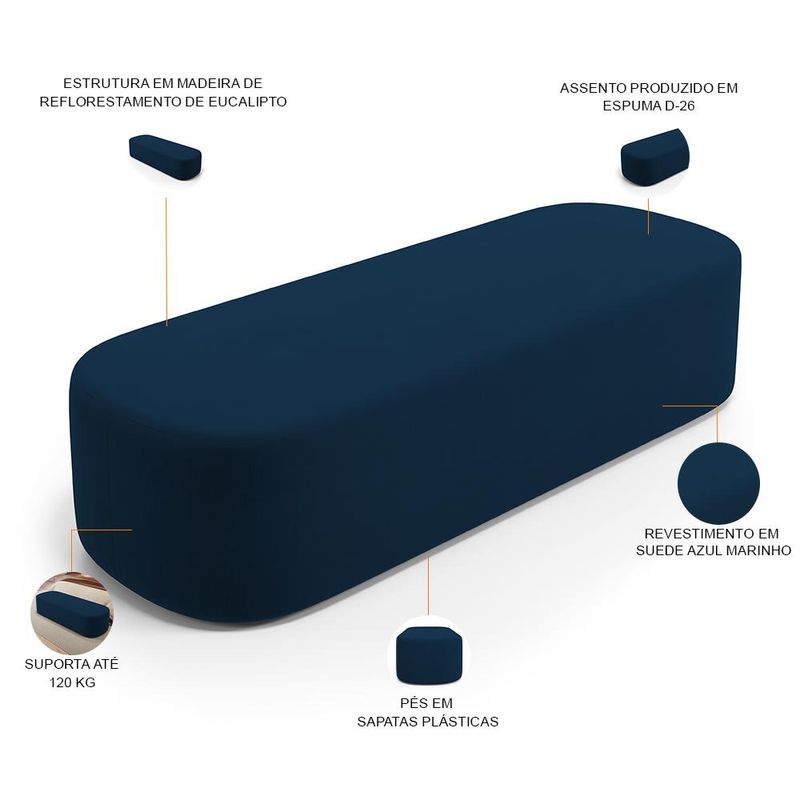 Com um design minimalista, o Kit 2 Puffs Decorativo Doha, da Lyam Decor, é sinônimo de modernidade e versatilidade. Com cantos curvos e fluidos, esse puff retangular além de dar um toque de contemporaneidade à decoração, ainda pode ser aproveitado de diversas formas, desde assento extra para a sala de estar à recamier para o quarto, ou ainda como divisor de ambientes para living e outros espaços. Em outras palavras, esse puff orgânico é o complemento perfeito, já que harmoniza facilmente com vários estilos e ambientes, sem contar que oferece conforto e bem-estar. Então, não perca mais tempo e transforme a sua casa com esse puff que transborda beleza e suavidade na medida certa. Adicione agora mesmo ao sei carrinho! Dimensões da Poltrona (L x A x P) 195 x 42 x 60 cm Características: Estrutura em madeira de reflorestamento de eucalipto. Revestimento em Suede na cor Azul Marinho de alta qualidade. Assento com espuma D-26. Peso suportado: Até 120 kg. Pés em sapatas plásticas. - Por se tratar de estofado as medidas podem ter uma pequena variação de até 3 cm. - A tonalidade do produto real poderá ter ligeira variação devido o lote de tecidos. Observações importantes: - Produto para uso residencial em ambiente interno, não devendo ficar exposto diretamente ao sol, calor e umidade excessivos. - Pode haver alguma diferença de tonalidade entre a imagem e o produto real, por conta do tratamento de imagens e a calibração de cores do seu monitor. - As imagens são meramente ilustrativas, não acompanham objetos de decoração e eletrônicos. - Ao receber a mercadoria, o cliente deve verificar as condições da embalagem, caso haja alguma avaria não assine o comprovante de recebimento e entre em contato com nossa loja para orientações. - Montagem, desmontagem e outras instalações serão de responsabilidade do cliente. Não nos responsabilizamos, no ato da entrega, por subir escadas/elevadores ou pelo transporte por guincho em apartamentos. Eventuais despesas são de responsabilidade do comprador. - Confira as dimensões do produto e certifique-se de que passará normalmente por supostos elevadores, portas, escadas e/ou corredores de sua residência. - Para mais informações, acesse nossa Central de Atendimento.