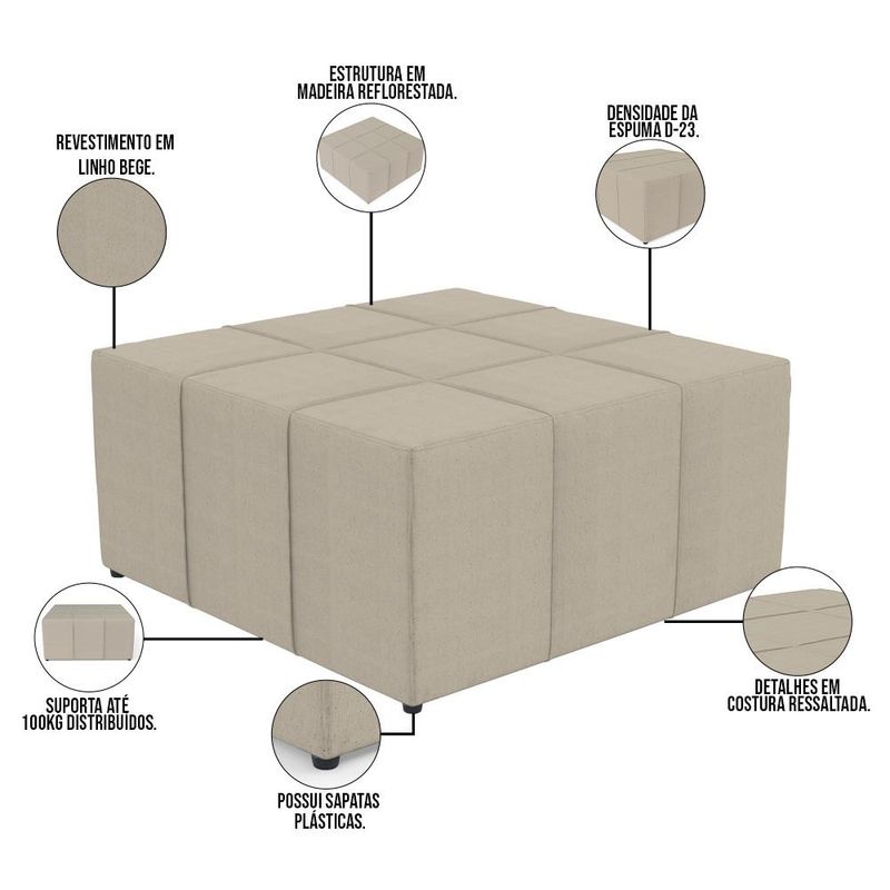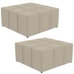 Extremamente confortável, ideal para quem busca por funcionalidade e beleza embutidos num único produto, o Kit 02 Puffs Decorativos Para Sala de Estar Quadrado Milano 90x90cm W01 Linho Bege - Lyam Decor é perfeito para seu ambiente e irá superar todas as suas expectativas! É estruturado com espuma macia de alta densidade e revestimento de excelente qualidade, além dos detalhes da costura ressaltada em padrão quadriculado que arrematam muito bem toda a composição deixando-o ainda mais elegante. Possuindo diferentes funções, podendo ser disposto em salas de estar, garantindo assentos extras e apoio para os pés, servindo de suporte ou como mesa de centro, no quarto, em closets, integrando ambientes, dentre outras maneiras visto as infinitas possibilidades. Com certeza harmonizará e agregar ainda mais valor à decoração do seu lar, não perca esta oportunidade. Adquira já o seu! Dimensões do produto (L x A x P) 90 x 40 x 90 cm Características: Estrutura em eucalipto de reflorestamento, com imunização contra mofo, cupim e micro-organismos. Revestimento em Linho Bege com detalhe em costura ressaltada. Espuma com densidade D-23. 04 sapatas plásticas. Peso suportado: Até 100kg distribuídos. - Por se tratar de estofado as medidas podem ter uma pequena variação de até 3 cm. - A tonalidade do produto real poderá ter ligeira variação devido o lote de tecidos. Observações importantes: - Produto para uso residencial em ambiente interno, não devendo ficar exposto diretamente ao sol, calor e umidade excessivos. - Pode haver alguma diferença de tonalidade entre a imagem e o produto real, por conta do tratamento de imagens e a calibração de cores do seu monitor. - As imagens são meramente ilustrativas, não acompanham objetos de decoração e eletrônicos. - Ao receber a mercadoria, o cliente deve verificar as condições da embalagem, caso haja alguma avaria não assine o comprovante de recebimento. - Montagem, desmontagem e outras instalações serão de responsabilidade do cliente. Não nos responsabilizamos, no ato da entrega, por subir escadas/elevadores ou pelo transporte por guincho em apartamentos. Eventuais despesas são de responsabilidade do comprador. - Confira as dimensões do produto e certifique-se de que passará normalmente por supostos elevadores, portas, escadas e/ou corredores de sua residência.