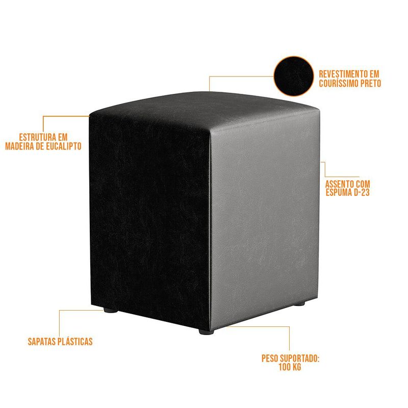 Descrição do produto: Muito mais do que assentos para receber visitas, o Puff Quadrado possui utilidades diversas. Opção ideal para quem deseja incluir alguns assentos extras em casa, ou está a procura de otimizar o espaço, produto compacto que cabe em baixo de qualquer móvel, seja ele aparador, home para sala de estar e muito mais. Não ocupa espaço e pode oferecer o conforto de forma completa também como apoio para os pés. Apropriado para uso em diversos ambientes da casa, tão quanto para eventos ou ocasiões, este tradicional modelo é tudo que você precisa. Dimensões do produto (L x A x P) 35 x 42 x 35 cm Características Estrutura em madeira de reflorestamento de eucalipto ou pinus, compensado ou MDF. Revestimento em tecido couríssimo preto de alta qualidade. Pés em sapatas plásticas. Suporta até 100 kg sem impacto. - Por se tratar de estofado as medidas podem ter uma pequena variação de até 3 cm. - A tonalidade do produto real poderá ter ligeira variação devido o lote de tecidos. Observações importantes: - Produto para uso residencial em ambiente interno, não devendo ficar exposto diretamente ao sol, calor e umidade excessivos. - Pode haver alguma diferença de tonalidade entre a imagem e o produto real, por conta do tratamento de imagens e a calibração de cores do seu monitor. - As imagens são meramente ilustrativas, não acompanham objetos de decoração e eletrônicos. - Ao receber a mercadoria, o cliente deve verificar as condições da embalagem, caso haja alguma avaria não assine o comprovante de recebimento. - Montagem, desmontagem e outras instalações serão de responsabilidade do cliente. Não nos responsabilizamos, no ato da entrega, por subir escadas/elevadores ou pelo transporte por guincho em apartamentos. Eventuais despesas são de responsabilidade do comprador. - Confira as dimensões do produto e certifique-se de que passará normalmente por supostos elevadores, portas, escadas e/ou corredores de sua residência.