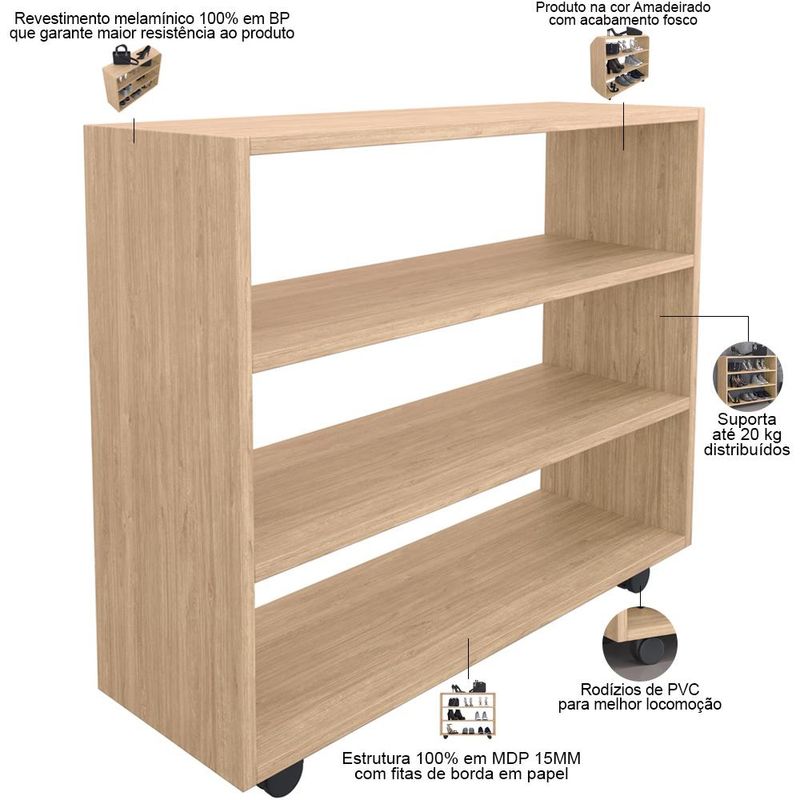 Compacta e multifuncional, o Kit 02 Sapateiras Multiuso Organizador Com 03 Prateleiras E Rodizio Pérola L03 Amadeirado - Lyam é a peça chave para quem quer ter um cantinho organizado e charmoso! Possui 3 prateleiras para dispor melhor seus itens mantendo tudo bem organizado, além de otimizar seu espaço. É produzida com materiais de excelente qualidade, com acabamento impecável e revestimento melamínico, que assegura maior resistência ao produto. Permite infinitas combinações, seja para quarto, dormitório ou closet, dentre outros. Garanta já a sua! Dimensões do produto (L x A x P) 70,5 x 54,1 x 22,3 cm Características: Estrutura 100% em MDP 15mm. Fitas com borda de papel. Revestimento melamínico 100% em BP, que garante maior resistência ao produto. 04 rodízios de PVC para fácil locomoção. Suporta até 20Kg. Altura de 16 cm entre as prateleiras. Produto na Cor Amadeirado, com acabamento Fosco. - Produto entregue desmontado, acompanha manual de montagem. - Montagem com cavilhas e parafusos zincados. - A limpeza deve ser feita com pano levemente umedecido em água limpa, sem esfregar, não utilizar produtos abrasivos, desengordurantes, álcool ou solvente. Observações importantes: - Produto para uso residencial em ambiente interno, não devendo ficar exposto diretamente ao sol, calor e umidade excessivos. - Pode haver alguma diferença de tonalidade entre a imagem e o produto real, por conta do tratamento de imagens e a calibração de cores do seu monitor. - As imagens são meramente ilustrativas, não acompanham objetos de decoração e eletrônicos. - Ao receber a mercadoria, o cliente deve verificar as condições da embalagem, caso haja alguma avaria não assine o comprovante de recebimento e entre em contato com nossa loja para orientações. - Montagem, desmontagem e outras instalações serão de responsabilidade do cliente. Não nos responsabilizamos, no ato da entrega, por subir escadas/elevadores ou pelo transporte por guincho em apartamentos. Eventuais despesas são de responsabilidade do comprador. - Confira as dimensões do produto e certifique-se de que passará normalmente por supostos elevadores, portas, escadas e/ou corredores de sua residência.