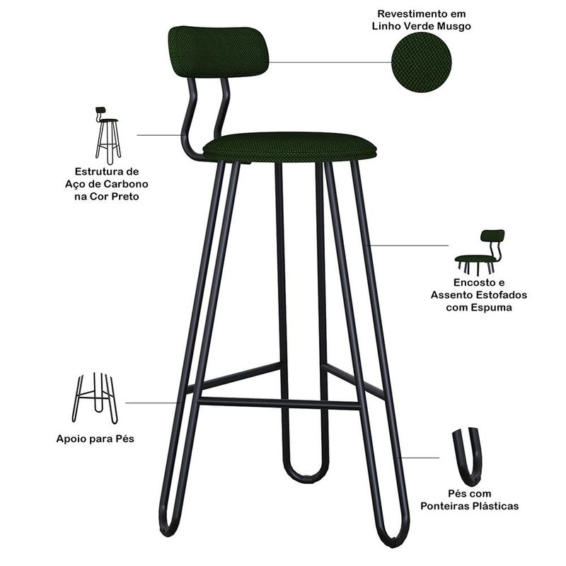 O Kit 03 Banqueta Áris é a escolha ideal para quem busca unir design moderno, conforto e resistência. Com sua estrutura metálica resistente e acabamento refinado, ela combina leveza visual e alta durabilidade. O assento e o encosto são estofados com espuma de alta qualidade, proporcionando maior conforto no uso diário. Possui apoio para os pés, oferecendo mais comodidade, além de pés com ponteiras plásticas que ajudam a proteger o piso. Perfeita para compor áreas gourmet, cozinhas e bancadas, a Banqueta Áris valoriza o ambiente com estilo e funcionalidade. Garanta já a sua! Dimensões da Banqueta (L x A x P) 42 x 98 x 52 cm Altura do chão ao assento: 75 cm Altura do encosto: 11,5 cm Características: Estrutura fixa em aço carbono com pintura epóxi na cor preto. Encosto produzido com Espuma D-22 Assento produzido com Espuma D-28 Revestimento em Linho Verde Musgo Peso suportado de até 120 kg. Produto entregue desmontado, acompanha manual de montagem. - Por se tratar de estofado as medidas podem ter uma pequena variação de até 3 cm. - A tonalidade do produto real poderá ter ligeira variação devido o lote de tecidos. - A limpeza deve ser feita com pano levemente umedecido em água limpa, sem esfregar, não utilizar produtos abrasivos, desengordurantes, álcool ou solvente. Observações importantes: - Produto para uso residencial em ambiente interno, não devendo ficar exposto diretamente ao sol, calor e umidade excessivos. - Pode haver alguma diferença de tonalidade entre a imagem e o produto real, por conta do tratamento de imagens e a calibração de cores do seu monitor. - As imagens são meramente ilustrativas, não acompanham objetos de decoração e eletrônicos. - Ao receber a mercadoria, o cliente deve verificar as condições da embalagem, caso haja alguma avaria não assine o comprovante de recebimento. - Montagem, desmontagem e outras instalações serão de responsabilidade do cliente. Não nos responsabilizamos, no ato da entrega, por subir escadas/elevadores ou pelo transporte por guincho em apartamentos. Eventuais despesas são de responsabilidade do comprador. - Confira as dimensões do produto e certifique-se de que passará normalmente por supostos elevadores, portas, escadas e/ou corredores de sua residência.
