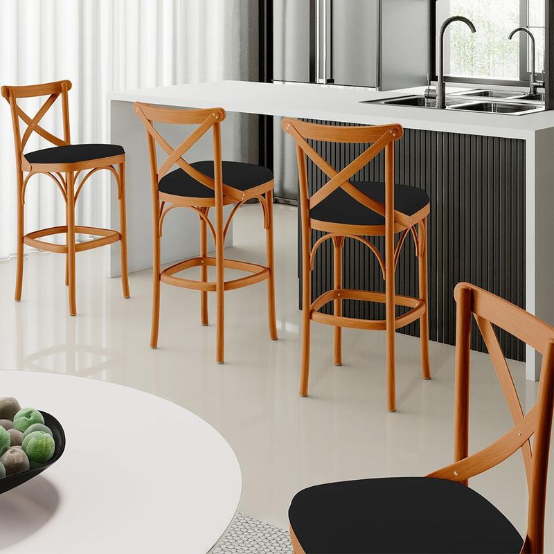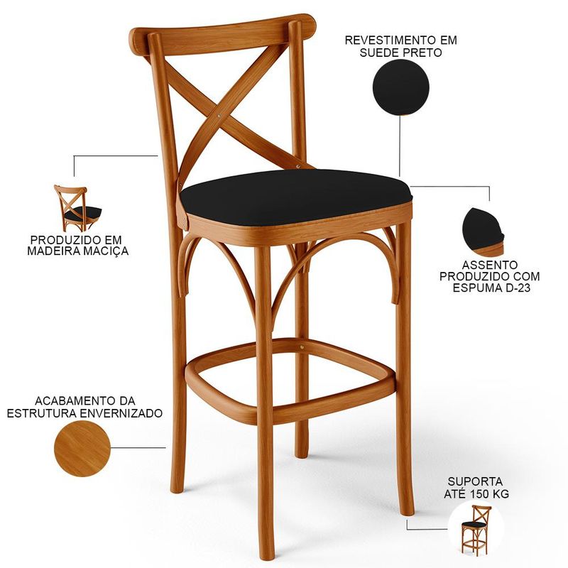 As banquetas têm ocupado um papel de destaque na decoração qualquer ambiente, pensando nisso a Banqueta Ávila chega trazendo um design moderno, confortável e prático. Seu assento estofado traz charme e entrega o conforto ideal a você e sua família. Quando o assunto é versatilidade, ela se propõe a agradar todos os estilos e se encaixar em bares, áreas gourmet, bancadas, cozinhas, salas de jantar e estar e até restaurantes. Sua estrutura em madeira maciça, garante segurança e ainda adiciona toques de elegância e harmonia ao seu espaço. Garanta estilo ao seu ambiente e adquira já a sua!! Dimensões do produto (L x A x P) 50 x 103 x 56 cm Medidas Internas: Altura do encosto: 30 cm Altura do chão ao assento: 77 cm Largura do assento: 44 cm Profundidade do assento: 43 cm Largura total do encosto: 50 cm Altura do chão ao apoio de pés: 29,5 cm Largura do encosto: 36,5 cm Características: Estrutura em Madeira Maciça, com acabamento envernizado. Revestimento em Suede na cor Preto, de alta qualidade. Assento estofado com espuma D-23. Suporta até 150 kg. - Produto entregue montado. - Por se tratar de estofado as medidas podem ter uma pequena variação de até 3 cm. - A tonalidade do produto real poderá ter ligeira variação devido o lote de tecidos. - A limpeza deve ser feita com pano umedecido em água limpa, sem esfregar, não utilizar produtos abrasivos, desengordurantes, álcool ou solvente. Observações importantes: - Produto para uso residencial em ambiente interno, não devendo ficar exposto diretamente ao sol, calor e umidade excessivos. - Pode haver alguma diferença de tonalidade entre a imagem e o produto real, por conta do tratamento de imagens e a calibração de cores do seu monitor. - As imagens são meramente ilustrativas, não acompanham objetos de decoração e eletrônicos. - Ao receber a mercadoria, o cliente deve verificar as condições da embalagem, caso haja alguma avaria não assine o comprovante de recebimento. - Montagem, desmontagem e outras instalações serão de responsabilidade do cliente. Não nos responsabilizamos, no ato da entrega, por subir escadas/elevadores ou pelo transporte por guincho em apartamentos. Eventuais despesas são de responsabilidade do comprador. - Confira as dimensões do produto e certifique-se de que passará normalmente por supostos elevadores, portas, escadas e/ou corredores de sua residência.