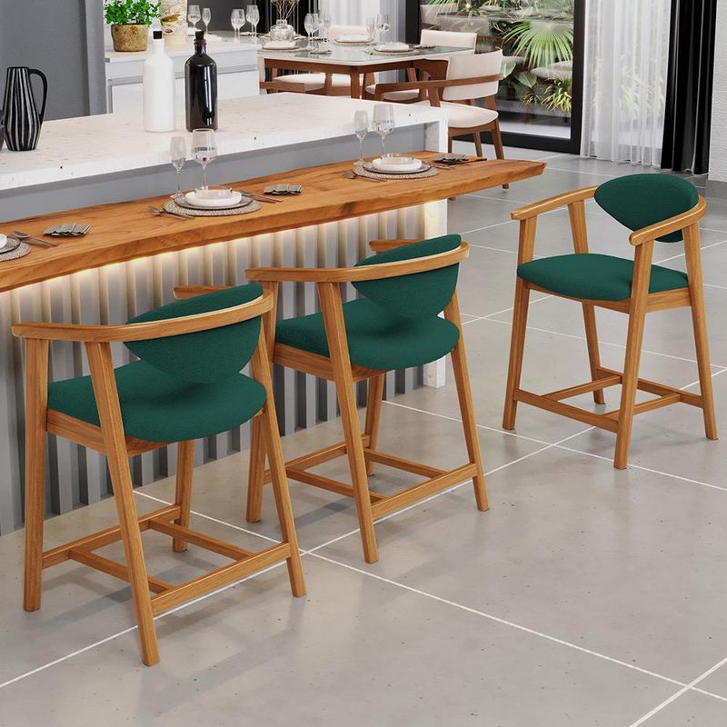 Crie um ambiente sofisticado e acolhedor com o Kit 03 Banquetas Baixa Cecília, da Lyam Decor. Com design moderno essa banqueta é uma peça muito versátil, pois você pode aproveitá-la em diversos ambientes, desde cozinha, sala de jantar, bancada até a área gourmet ou bar e, assim, agregar o máximo de beleza e conforto. Afinal, essa banqueta de madeira se destaca pela sua estrutura robusta que resistência e durabilidade. Já o assento estofado oferece o máximo conforto, enquanto o encosto proporciona suporte ergonômico sem igual. Combinando elegância e praticidade, essa banqueta baixa com encosto é perfeita para quem deseja um toque de requinte em qualquer ambiente. Adicione um charme especial ao seu lar com essa peça indispensável. Adicione ao seu carrinho e desfrute momentos de alegria com a Banqueta Cecília! Dimensões da Banqueta (L x A x P) 51 x 90 x 47 cm Medidas Internas: Altura do chão ao assento: 60 cm Assento livre (L x A x P): 44 x 4,5 x 46,5 cm Encosto livre (L x A): 41 x 22 cm Altura total do encosto: 33 cm Altura interna do braço: 18 cm Altura do chão ao início do braço: 76 cm Altura do chão ao apoio de pés: 17 cm Largura interna do apoio de pés: 27 cm Altura do apoio de pés: 4,5 cm Características: Estrutura em madeira de reflorestamento de eucalipto vermelho tratado. Revestimento em tecido Bouclê de alta qualidade na cor Verde. Assento e encosto fixos tapeçados com espuma D-28. Encosto com design curvo para maior conforto e ergonomia. Pés em madeira maciça envernizada na cor Nozes. Peso suportado: Até 120 kg. - Nunca sentar nos braços ou encosto do produto. - Por se tratar de estofado as medidas podem ter uma pequena variação de até 3 cm. - A tonalidade do produto real poderá ter ligeira variação devido o lote de tecidos. - Indicado para uso residencial, sua limpeza deve ser feita com pano levemente umedecido em água limpa, sem esfregar, não utilizar produtos abrasivos, desengordurantes, álcool ou solvente. Observações importantes: - Produto para uso residencial em ambiente interno, não devendo ficar exposto diretamente ao sol, calor e umidade excessivos. - Pode haver alguma diferença de tonalidade entre a imagem e o produto real, por conta do tratamento de imagens e a calibração de cores do seu monitor. - As imagens são meramente ilustrativas, não acompanham objetos de decoração e eletrônicos. - Ao receber a mercadoria, o cliente deve verificar as condições da embalagem, caso haja alguma avaria não assine o comprovante de recebimento e entre em contato com nossa loja para orientações. - Montagem, desmontagem e outras instalações serão de responsabilidade do cliente. Não nos responsabilizamos, no ato da entrega, por subir escadas/elevadores ou pelo transporte por guincho em apartamentos. Eventuais despesas são de responsabilidade do comprador. - Confira as dimensões do produto e certifique-se de que passará normalmente por supostos elevadores, portas, escadas e/ou corredores de sua residência. - Para mais informações, acesse nossa Central de Atendimento.