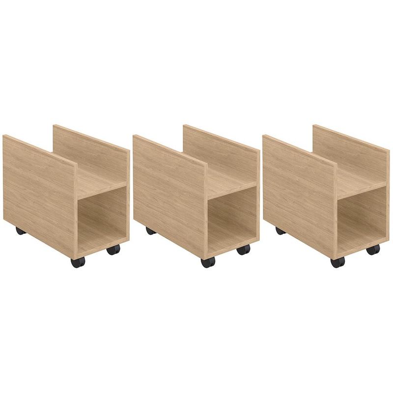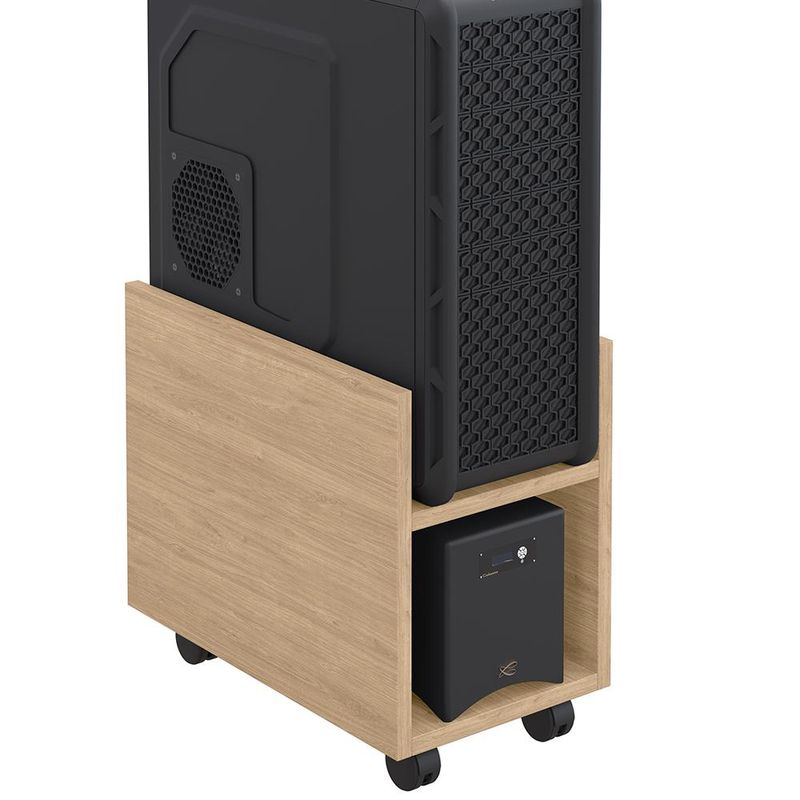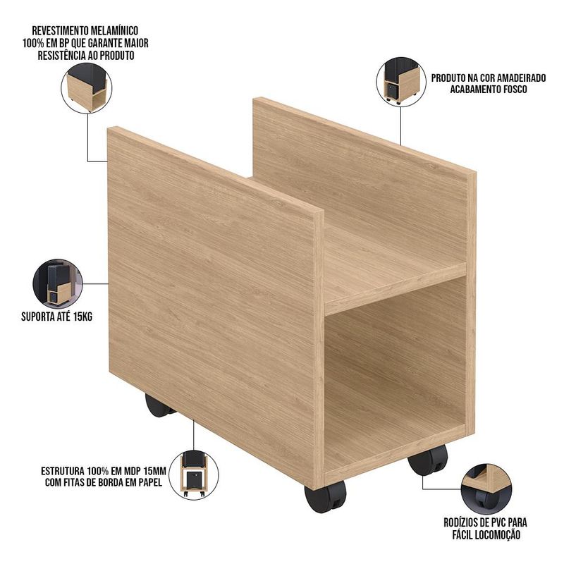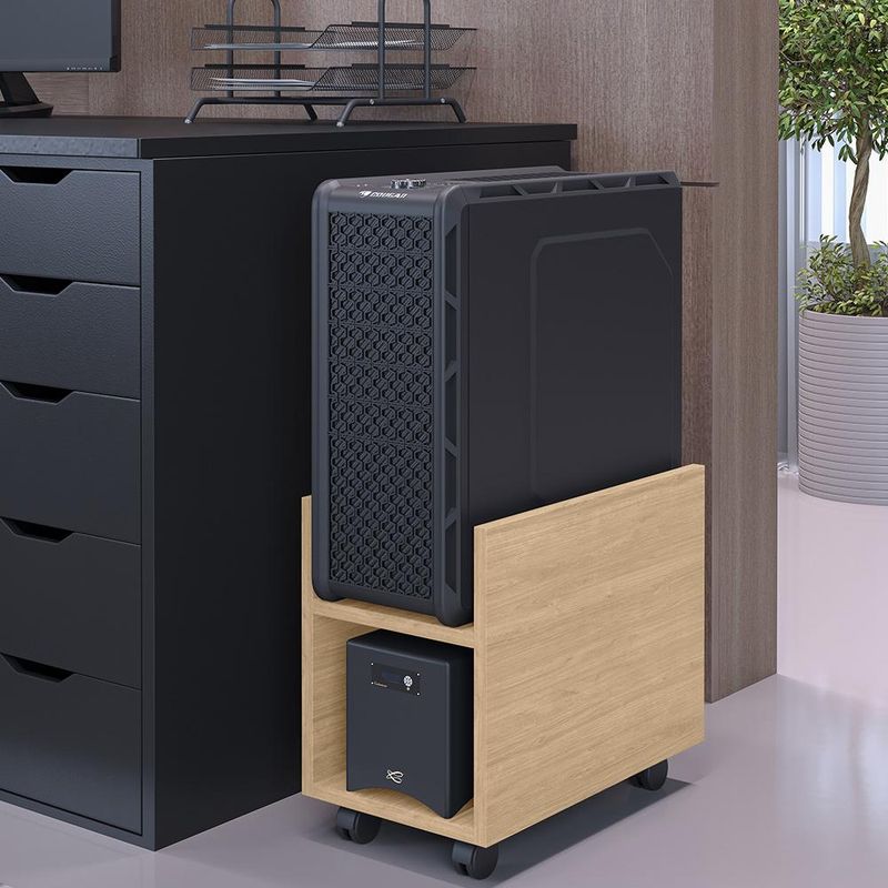 Organização, praticidade e segurança são qualidades que definem o Kit 03 Suportes Para Cpu E Nobreak Com Rodízios Guide L03 Amadeirado - Lyam! Vem para auxiliar você em suas horas de trabalho, estudos ou entretenimento em frente ao computador, pois ajuda a manter o gabinete (onde estão armazenados todos os componentes mais importantes do seu PC) ventilando de maneira correta, protegido de ficar diretamente no chão, garantindo maior longevidade às peças. Com acabamento impecável, possui revestimento melamínico que assegura resistência ao produto, conta ainda com rodízios para facilitar a locomoção. Sua pegada Slim também merece destaque, por trazer modernidade ao ambiente e conversar super bem com a decoração. Não perca tempo e aproveite! Dimensões do produto (L x A x P) 23 x 30 x 40 cm Características: Estrutura 100% em MDP 15mm. Fitas com borda de papel. Revestimento melamínico 100% em BP, que garante maior resistência ao produto. 04 rodízios de PVC para fácil locomoção. Suporta até 15Kg. Prateleira com largura de 19cm. Produto na Cor Amadeirado, com acabamento Fosco. - Produto entregue desmontado, acompanha manual de montagem. - Montagem com cavilhas e parafusos zincados. - A limpeza deve ser feita com pano levemente umedecido em água limpa, sem esfregar, não utilizar produtos abrasivos, desengordurantes, álcool ou solvente. Observações importantes: - Produto para uso residencial em ambiente interno, não devendo ficar exposto diretamente ao sol, calor e umidade excessivos. - Pode haver alguma diferença de tonalidade entre a imagem e o produto real, por conta do tratamento de imagens e a calibração de cores do seu monitor. - As imagens são meramente ilustrativas, não acompanham objetos de decoração e eletrônicos. - Ao receber a mercadoria, o cliente deve verificar as condições da embalagem, caso haja alguma avaria não assine o comprovante de recebimento e entre em contato com nossa loja para orientações. - Montagem, desmontagem e outras instalações serão de responsabilidade do cliente. Não nos responsabilizamos, no ato da entrega, por subir escadas/elevadores ou pelo transporte por guincho em apartamentos. Eventuais despesas são de responsabilidade do comprador. - Confira as dimensões do produto e certifique-se de que passará normalmente por supostos elevadores, portas, escadas e/ou corredores de sua residência.