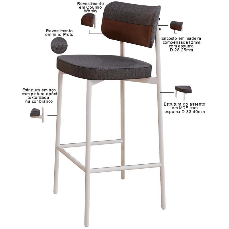 Transforme sua área gourmet com a Banqueta Kaira! Desfrute de momentos inesquecíveis desfrutando do conforto da Banqueta Kaira, projetada para oferecer o máximo de conforto e elegância na sua sala de jantar ou cozinha. Com encosto curvo, ofertando maior conforto no uso, e assento estofado com uma espuma de altíssima qualidade, ela proporciona suporte ideal para longas refeições e conversas agradáveis. Além de combinar durabilidade e estilo, ela é a escolha perfeita para quem busca sofisticação e bem-estar em cada detalhe. Aproveite! Dimensões da Banqueta (L x A x P) 44,2 x 103,5 x 44 cm Altura do chão ao assento: 76,2 Altura do encosto: 21 Características: Estrutura fixa em aço carbono com pintura epóxi na cor branco. Encosto produzido em madeira compensada com espuma D-28, 25mm. Assento produzido em MDF com espuma D-33, 40mm. Revestimento em Linho Preto Courino Whisky. Peso suportado de até 120 kg. Produto entregue desmontado, acompanha manual de montagem. - Por se tratar de estofado as medidas podem ter uma pequena variação de até 3 cm. - A tonalidade do produto real poderá ter ligeira variação devido o lote de tecidos. - A limpeza deve ser feita com pano levemente umedecido em água limpa, sem esfregar, não utilizar produtos abrasivos, desengordurantes, álcool ou solvente. Observações importantes: - Produto para uso residencial em ambiente interno, não devendo ficar exposto diretamente ao sol, calor e umidade excessivos. - Pode haver alguma diferença de tonalidade entre a imagem e o produto real, por conta do tratamento de imagens e a calibração de cores do seu monitor. - As imagens são meramente ilustrativas, não acompanham objetos de decoração e eletrônicos. - Ao receber a mercadoria, o cliente deve verificar as condições da embalagem, caso haja alguma avaria não assine o comprovante de recebimento. - Montagem, desmontagem e outras instalações serão de responsabilidade do cliente. Não nos responsabilizamos, no ato da entrega, por subir escadas/elevadores ou pelo transporte por guincho em apartamentos. Eventuais despesas são de responsabilidade do comprador. - Confira as dimensões do produto e certifique-se de que passará normalmente por supostos elevadores, portas, escadas e/ou corredores de sua residência.