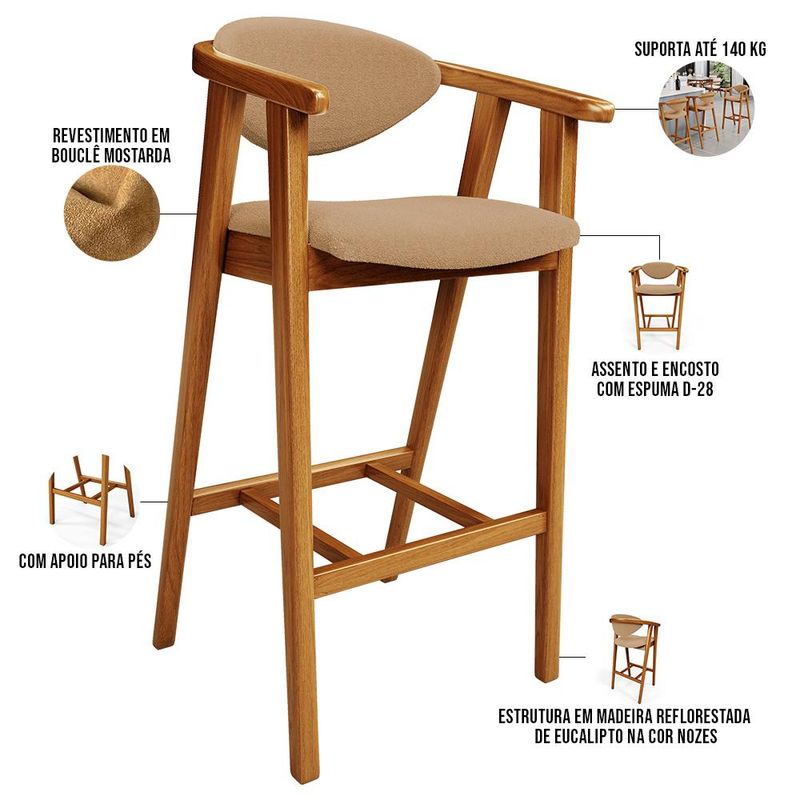 A melhor escolha para os momentos de confraternização no aconchego da sua casa, acaba de chegar! O Kit 04 Banquetas Altas Cecília vem com a personalidade e elegância que sua decoração merece! É ideal desde refeições rápidas, até um Happy Hour com os amigos, família. Seu design único valoriza o ambiente, sem deixar pra trás a beleza e qualidade! Para deixar a sua área gourmet mais aconchegante, ela possui assento e encosto estofados, confeccionados com materiais de excelente qualidade, e extremamente resistentes. Possui altura ideal, garantindo o encaixe perfeito no ambiente, otimizando seu espaço e promovendo máximo conforto. Pode ser usada em bancada, cozinha americana, home bar, ou área gourmet! As possibilidades são infinitas e as combinações ficarão extremamente elegantes. Adquira já a sua! Dimensões do produto (L x A x P) 51 x 102 x 47 cm Medidas Internas: Altura do encosto: 22 cm Altura total do encosto: 33 cm Largura do encosto: 41 cm Altura do assento: 4,5 cm Altura do chão ao braço: 88 cm Profundidade do assento: 46,5 cm Largura do assento: 44 cm Altura interna do braço: 18 cm Altura do chão ao assento: 70 cm Altura do chão ao apoio de pés: 30 cm Altura do apoio de pés: 4,5 cm Largura interna do apoio de pés: 27 cm Características: Estrutura em madeira de reflorestamento de eucalipto vermelho tratado. Revestimento em Bouclê na cor Mostarda. Assento com espuma D-28. Encosto com espuma D-28. Peso suportado: Até 140 kg. Estrutura de Madeira na cor Nozes. Produto entregue montado. - Por se tratar de estofado as medidas podem ter uma pequena variação de até 3 cm. - A tonalidade do produto real poderá ter ligeira variação devido o lote de tecidos. - A limpeza deve ser feita com pano levemente umedecido em água limpa, sem esfregar, não utilizar produtos abrasivos, desengordurantes, álcool ou solvente. - Nunca sentar nos braços ou encosto do produto. Observações importantes: - Produto para uso residencial em ambiente interno, não devendo ficar exposto diretamente ao sol, calor e umidade excessivos. - Pode haver alguma diferença de tonalidade entre a imagem e o produto real, por conta do tratamento de imagens e a calibração de cores do seu monitor. - As imagens são meramente ilustrativas, não acompanham objetos de decoração e eletrônicos. - Ao receber a mercadoria, o cliente deve verificar as condições da embalagem, caso haja alguma avaria não assine o comprovante de recebimento. - Montagem, desmontagem e outras instalações serão de responsabilidade do cliente. Não nos responsabilizamos, no ato da entrega, por subir escadas/elevadores ou pelo transporte por guincho em apartamentos. Eventuais despesas são de responsabilidade do comprador. - Confira as dimensões do produto e certifique-se de que passará normalmente por supostos elevadores, portas, escadas e/ou corredores de sua residência.