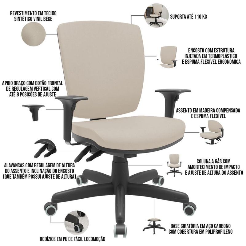 O Kit 04 Cadeiras Diretor Giratória Flexi , é uma opção robusta e elegante para um ambiente de trabalho confortável. Essa cadeira combina elementos de design moderno e materiais duráveis para oferecer suporte ergonômico e resistência ao uso diário. Projetada para uso em ambientes de trabalho, essas cadeiras são conhecidas por sua estabilidade e durabilidade. O encosto alto e assento estofado são características importantes dessa cadeira, pois fornecem apoio e conforto adicional para a região lombar e ajudam a manter uma postura correta durante o período de ofício, é uma escolha funcional e esteticamente agradável para um ambiente de trabalho. Com seu design ergonômico, materiais resistentes e conforto adicional, essa cadeira oferece suporte adequado e durabilidade para enfrentar as demandas evitando assim o desconforto e fadiga ao longo do dia a dia no escritório. Além disso, apresenta recursos como altura ajustável, braços com regulagem vertical e rodízios para facilitar a movimentação ao redor do escritório. Adquira mais conforto para suas horas de trabalho! Dimensões do produto (L x A x P) 64 cm x 96 cm x 56 cm Medidas internas: Profundidade assento: 38 cm Largura assento: 49 cm Altura encosto: 52 cm Altura do chão ao assento: 44,4 cm Largura do encosto: 48,5 cm Características: Cadeira diretor, encosto com estrutura injetada em termoplástico. Apoio para braço com botão frontal de regulagem vertical, com até 8 posições de ajuste. Assento em madeira compensada e estofado em espuma flexível, com coluna a gás e amortecimento de impacto. Possui alavancas de regulagem de altura do assento e inclinação do encosto. Revestimento em Vinil na cor Bege. Base giratória em Aço de Carbono com cobertura em polipropileno. Rodízios em PU de fácil locomoção. Possui certificado de Laudo Ergonômico. Suporta até 110 kg. - Por se tratar de estofado as medidas podem ter uma pequena variação de até 3 cm. - A tonalidade do produto real poderá ter ligeira variação devido o lote de tecidos. Observações importantes: - A montagem será de responsabilidade do comprador; - Responsabilizamo-nos pela entrega em todo território nacional, até onde as rodovias alcançam, entregas fluviais ou aéreas devem ser cotadas a parte; - Não nos responsabilizamos, no ato da entrega, por subir escadas/elevadores ou transporte por guincho em apartamentos. - Eventuais despesas são de responsabilidade do comprador; - Confira as dimensões do produto e certifique-se de que passará normalmente por supostos elevadores, portas, escadas e/ou corredores de sua residência;