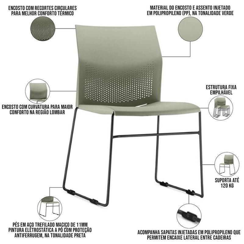 Descubra o Kit 04 Cadeiras Fixa Empilhável Link, da Lyam Decor, a solução perfeita para quem busca funcionalidade e elegância em um só produto! Feita em polipropileno de alta qualidade e com uma robusta base em aço trefilado, essa cadeira empilhável é ideal para transformar qualquer espaço comercial ou corporativo. Seja em escolas, escritórios, refeitórios, salões de eventos ou aonde mais você precisar, a Cadeira Link se adapta com facilidade e charme. Sua estrutura leve e empilhável facilita o armazenamento, enquanto as sapatas conectoras permitem unir várias unidades, proporcionando uma organização impecável e eficiente. Crie ambientes flexíveis e dinâmicos, prontos para receber todos os tipos de eventos e reuniões com estilo e conforto. Experimente a Cadeira Link e leve inovação ao seu espaço! Dimensões da Cadeira (L x A x P) 55,5 x 82 x 55 cm Medidas Internas: Altura do chão ao assento: 44,5 cm Encosto (L x A): 46,2 x 44,5 cm Profundidade dos pés: 52 cm Largura interna entre os pés: 44,5 cm Profundidade interna entre os pés: 48 cm Características: Material do encosto e assento injetado em Polipropileno (PP), na tonalidade Verde. Pés em aço trefilado maciço de 11mm com pintura eletrostática a pó com proteção antiferrugem, na tonalidade Preta. Encosto com recortes circulares para melhor conforto térmico. Encosto com curvatura para maior conforto na região lombar. Acompanha sapatas injetadas em polipropileno que permitem encaixe lateral entre Cadeiras Fixa, possibilitando o alinhamento e organização em espaços coletivos, e prevenção de riscos no piso quando em contato com a superfície Peso máximo suportado 120 kg. Estrutura fixa empilhável. Produto 100% Nacional. - Nunca sentar nos braços ou encosto do produto. - Indicado para uso residencial, sua limpeza deve ser feita com pano levemente umedecido em água limpa, sem esfregar, não utilizar produtos abrasivos, desengordurantes, álcool ou solvente. Observações importantes: - Produto para uso residencial em ambiente interno, não devendo ficar exposto diretamente ao sol, calor e umidade excessivos. - Pode haver alguma diferença de tonalidade entre a imagem e o produto real, por conta do tratamento de imagens e a calibração de cores do seu monitor. - As imagens são meramente ilustrativas, não acompanham objetos de decoração e eletrônicos. - Ao receber a mercadoria, o cliente deve verificar as condições da embalagem, caso haja alguma avaria não assine o comprovante de recebimento e entre em contato com nossa loja para orientações. - Montagem, desmontagem e outras instalações serão de responsabilidade do cliente. Não nos responsabilizamos, no ato da entrega, por subir escadas/elevadores ou pelo transporte por guincho em apartamentos. Eventuais despesas são de responsabilidade do comprador. - Confira as dimensões do produto e certifique-se de que passará normalmente por supostos elevadores, portas, escadas e/ou corredores de sua residência. - Para mais informações, acesse nossa Central de Atendimento.