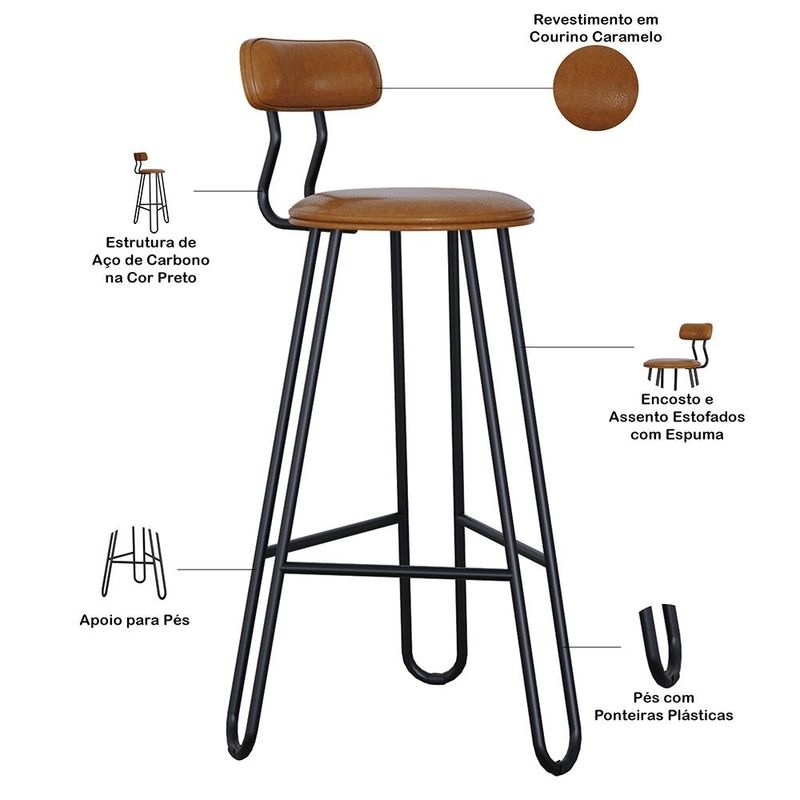 O Kit 05 Banqueta Áris é a escolha ideal para quem busca unir design moderno, conforto e resistência. Com sua estrutura metálica resistente e acabamento refinado, ela combina leveza visual e alta durabilidade. O assento e o encosto são estofados com espuma de alta qualidade, proporcionando maior conforto no uso diário. Possui apoio para os pés, oferecendo mais comodidade, além de pés com ponteiras plásticas que ajudam a proteger o piso. Perfeita para compor áreas gourmet, cozinhas e bancadas, a Banqueta Áris valoriza o ambiente com estilo e funcionalidade. Garanta já a sua! Dimensões da Banqueta (L x A x P) 42 x 98 x 52 cm Altura do chão ao assento: 75 cm Altura do encosto: 11,5 cm Características: Estrutura fixa em aço carbono com pintura epóxi na cor preto. Encosto produzido com Espuma D-22 Assento produzido com Espuma D-28 Revestimento em Courino Caramelo Peso suportado de até 120 kg. Produto entregue desmontado, acompanha manual de montagem. - Por se tratar de estofado as medidas podem ter uma pequena variação de até 3 cm. - A tonalidade do produto real poderá ter ligeira variação devido o lote de tecidos. - A limpeza deve ser feita com pano levemente umedecido em água limpa, sem esfregar, não utilizar produtos abrasivos, desengordurantes, álcool ou solvente. Observações importantes: - Produto para uso residencial em ambiente interno, não devendo ficar exposto diretamente ao sol, calor e umidade excessivos. - Pode haver alguma diferença de tonalidade entre a imagem e o produto real, por conta do tratamento de imagens e a calibração de cores do seu monitor. - As imagens são meramente ilustrativas, não acompanham objetos de decoração e eletrônicos. - Ao receber a mercadoria, o cliente deve verificar as condições da embalagem, caso haja alguma avaria não assine o comprovante de recebimento. - Montagem, desmontagem e outras instalações serão de responsabilidade do cliente. Não nos responsabilizamos, no ato da entrega, por subir escadas/elevadores ou pelo transporte por guincho em apartamentos. Eventuais despesas são de responsabilidade do comprador. - Confira as dimensões do produto e certifique-se de que passará normalmente por supostos elevadores, portas, escadas e/ou corredores de sua residência.