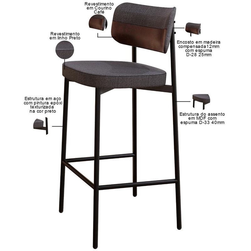 Transforme sua área gourmet com a Banqueta Kaira! Desfrute de momentos inesquecíveis desfrutando do conforto da Banqueta Kaira, projetada para oferecer o máximo de conforto e elegância na sua sala de jantar ou cozinha. Com encosto curvo, ofertando maior conforto no uso, e assento estofado com uma espuma de altíssima qualidade, ela proporciona suporte ideal para longas refeições e conversas agradáveis. Além de combinar durabilidade e estilo, ela é a escolha perfeita para quem busca sofisticação e bem-estar em cada detalhe. Aproveite! Dimensões da Banqueta (L x A x P) 44,2 x 103,5 x 44 cm Altura do chão ao assento: 76,2 Altura do encosto: 21 Características: Estrutura fixa em aço carbono com pintura epóxi na cor preto. Encosto produzido em madeira compensada com espuma D-28, 25mm. Assento produzido em MDF com espuma D-33, 40mm. Revestimento em Linho Preto Courino Café. Peso suportado de até 120 kg. Produto entregue desmontado, acompanha manual de montagem. - Por se tratar de estofado as medidas podem ter uma pequena variação de até 3 cm. - A tonalidade do produto real poderá ter ligeira variação devido o lote de tecidos. - A limpeza deve ser feita com pano levemente umedecido em água limpa, sem esfregar, não utilizar produtos abrasivos, desengordurantes, álcool ou solvente. Observações importantes: - Produto para uso residencial em ambiente interno, não devendo ficar exposto diretamente ao sol, calor e umidade excessivos. - Pode haver alguma diferença de tonalidade entre a imagem e o produto real, por conta do tratamento de imagens e a calibração de cores do seu monitor. - As imagens são meramente ilustrativas, não acompanham objetos de decoração e eletrônicos. - Ao receber a mercadoria, o cliente deve verificar as condições da embalagem, caso haja alguma avaria não assine o comprovante de recebimento. - Montagem, desmontagem e outras instalações serão de responsabilidade do cliente. Não nos responsabilizamos, no ato da entrega, por subir escadas/elevadores ou pelo transporte por guincho em apartamentos. Eventuais despesas são de responsabilidade do comprador. - Confira as dimensões do produto e certifique-se de que passará normalmente por supostos elevadores, portas, escadas e/ou corredores de sua residência.