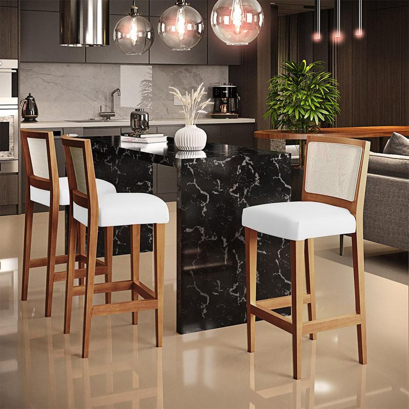 Um clássico que nunca sai de moda! O Kit 05 Banquetas Alta Cozinha Sala De Jantar Encosto Tela Branco Zion L02 Facto Branco - Lyam Decor, possui um estilo rustico que faltava para deixar sua casa ainda mais clássica. Seu encosto com o detalhe de tela sintética na cor branca trazem ainda mais estilo e destaque para sua decoração, junto com assento estofado que proporciona horas de conforto. A estrutura e o apoio para os pés, são responsáveis por garantir maior segurança à mesma. Pode ser acomodada em cozinha americana, ambientes integrados, espaços gourmets, bancadas ou em seu home bar, independente do lugar, ela desperta logo de cara o bom gosto e elegância, deixando tudo mais despojado, perfeita para criar um ambiente harmonioso e agradável para receber a família e amigos, sempre com muita receptividade! Características: Estrutura em madeira de reflorestamento de eucalipto vermelho tratado. Revestimento em Facto Branco de alta qualidade, acabamento fosco. Assento com espuma D-23. Encosto de madeira com tela sintética. Peso suportado: Até 130 kg. Apoio para os pés. Dimensões do produto (L x A x P) 41,5 x 103 x 50 cm Altura do chão ao assento: 75 cm Altura do encosto: 31 cm Largura do encosto: 41,5 cm Profundidade do encosto: 3,5 cm Altura do assento: 10,5 cm Largura do assento: 42,5 cm Profundidade do assento: 38,5 cm Altura do apoio para os pés: 5 cm - Por se tratar de estofado as medidas podem ter uma pequena variação de até 3 cm. - A tonalidade do produto real poderá ter ligeira variação devido o lote de tecidos. Observações importantes: - Produto para uso residencial em ambiente interno, não devendo ficar exposto diretamente ao sol, calor e umidade excessivos. - Pode haver alguma diferença de tonalidade entre a imagem e o produto real, por conta do tratamento de imagens e a calibração de cores do seu monitor. - As imagens são meramente ilustrativas, não acompanham objetos de decoração e eletrônicos. - Ao receber a mercadoria, o cliente deve verificar as condições da embalagem, caso haja alguma avaria não assine o comprovante de recebimento. - Montagem, desmontagem e outras instalações serão de responsabilidade do cliente. Não nos responsabilizamos, no ato da entrega, por subir escadas/elevadores ou pelo transporte por guincho em apartamentos. Eventuais despesas são de responsabilidade do comprador. - Confira as dimensões do produto e certifique-se de que passará normalmente por supostos elevadores, portas, escadas e/ou corredores de sua residência.