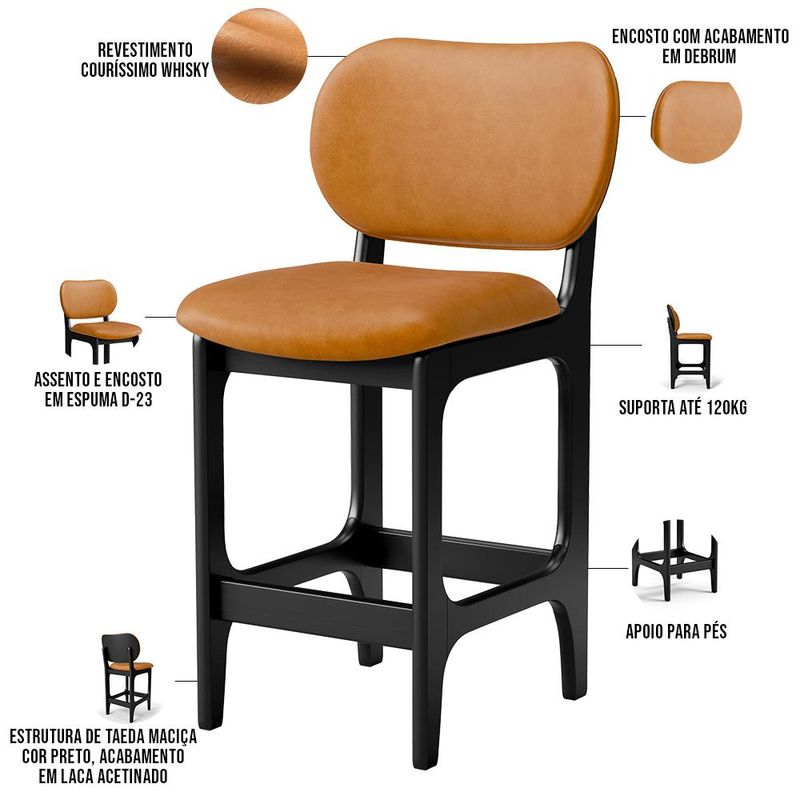 Amplamente sofisticada, o Kit 05 Banquetas Baixa Bar Cozinha Sala Jantar Betta L02 Couríssimo Whisky - Lyam Decor irá agregar ainda mais valor em sua decoração!! Sendo capaz de compor muito bem o ambiente, é produzida com materiais de excelente qualidade, a resistente estrutura em madeira de Taeda, na cor Preto, conta com apoio para os pés (que garante maior segurança), além do assento e encosto estofados super confortáveis e convidativos, que são revestidos em tecido Couríssimo, composição extremamente elegante. Podendo ser disposta em bancada, cozinha americana, espaço gourmet ou home bar, as possibilidades de combinação são infinitas, o que a torna perfeita para receber família e amigos sempre de forma agradável e aconchegante, sem perder a sobriedade e requinte que possui. Você e seu lar merecem, adquira já a sua!! Dimensões do produto (L x A x P) 50 x 90 x 55 cm Medidas Internas: Altura do encosto: 34 cm Altura do chão ao assento: 65 cm Largura do assento: 50 cm Profundidade do assento: 40 cm Altura do chão ao apoio de pés: 16 cm Características: Estrutura em madeira maciça de Taeda, na cor Preto com acabamento em laca acetinado. Revestimento em Couríssimo Whisky de alta qualidade, com acabamento semi brilho. Assento e encosto com espuma D-23. Acabamento em debrum no encosto. Suporta até 120 kg. Produto entregue montado. - Por se tratar de estofado as medidas podem ter uma pequena variação de até 3 cm. - A tonalidade do produto real poderá ter ligeira variação devido o lote de tecidos. - A limpeza deve ser feita com pano umedecido em água limpa, sem esfregar, não utilizar produtos abrasivos, desengordurantes, álcool ou solvente. Observações importantes: - Produto para uso residencial em ambiente interno, não devendo ficar exposto diretamente ao sol, calor e umidade excessivos. - Pode haver alguma diferença de tonalidade entre a imagem e o produto real, por conta do tratamento de imagens e a calibração de cores do seu monitor. - As imagens são meramente ilustrativas, não acompanham objetos de decoração e eletrônicos. - Ao receber a mercadoria, o cliente deve verificar as condições da embalagem, caso haja alguma avaria não assine o comprovante de recebimento. - Montagem, desmontagem e outras instalações serão de responsabilidade do cliente. Não nos responsabilizamos, no ato da entrega, por subir escadas/elevadores ou pelo transporte por guincho em apartamentos. Eventuais despesas são de responsabilidade do comprador. - Confira as dimensões do produto e certifique-se de que passará normalmente por supostos elevadores, portas, escadas e/ou corredores de sua residência.