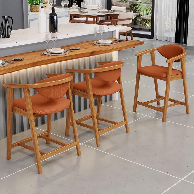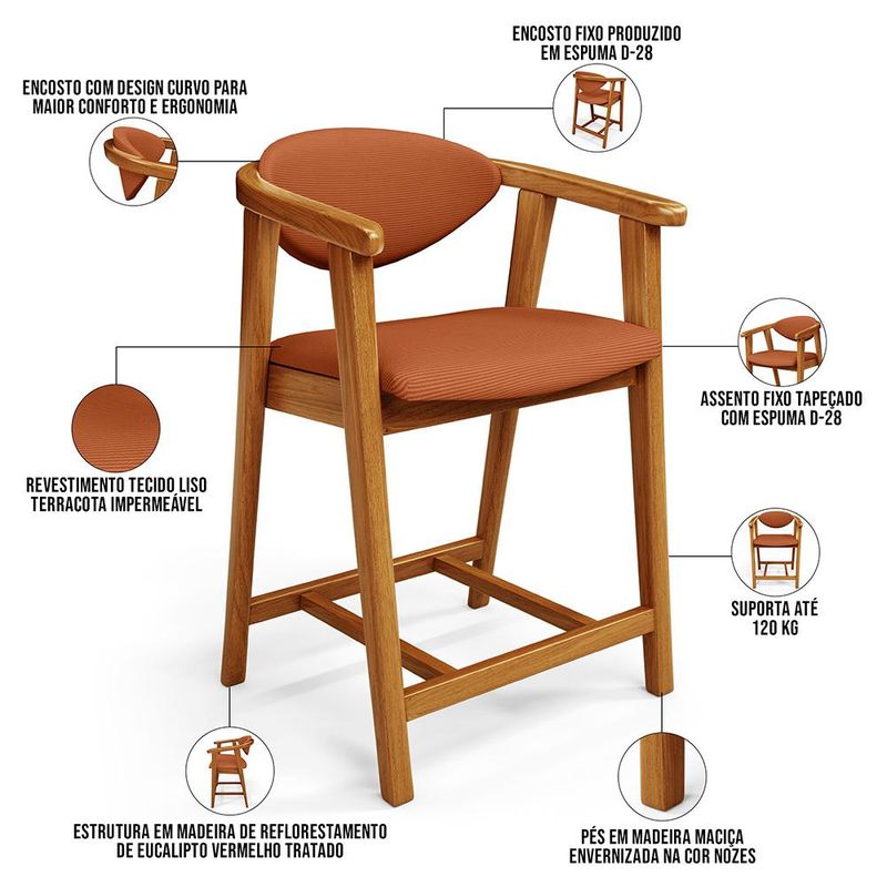 Transforme qualquer ambiente em um espaço sofisticado com o Kit 05 Banquetas Baixa Cecília, da Lyam Decor. Esse kit de banquetas combina design moderno e funcionalidade, já que é ideal para cozinha, sala de jantar, bancada ou área gourmet. Além disso, são feitas com madeira de eucalipto vermelho tratado, o que garante durabilidade e sustentabilidade. Já o assento e encosto estofados com espuma de alta densidade proporcionam máximo conforto durante suas refeições ou momentos de descontração. A versatilidade dessa banqueta de madeira com encosto faz dela a escolha perfeita para quem busca elegância e praticidade em cada detalhe. Leve mais alegria aos momentos com a família e amigos com a Banqueta Cecília. Dimensões da Banqueta (L x A x P) 51 x 90 x 47 cm Medidas Internas: Altura do chão ao assento: 60 cm Assento livre (L x A x P): 44 x 4,5 x 46,5 cm Encosto livre (L x A): 41 x 22 cm Altura total do encosto: 33 cm Altura interna do braço: 18 cm Altura do chão ao início do braço: 76 cm Altura do chão ao apoio de pés: 17 cm Largura interna do apoio de pés: 27 cm Altura do apoio de pés: 4,5 cm Características: Estrutura em madeira de reflorestamento de eucalipto vermelho tratado. Revestimento em tecido liso de alta qualidade na cor Terracota. Assento e encosto fixos tapeçados com espuma D-28. Encosto com design curvo para maior conforto e ergonomia. Pés em madeira maciça envernizada na cor Nozes. Peso suportado: Até 120 kg cada. - Nunca sentar nos braços ou encosto do produto. - Por se tratar de estofado as medidas podem ter uma pequena variação de até 3 cm. - A tonalidade do produto real poderá ter ligeira variação devido o lote de tecidos. - Indicado para uso residencial, sua limpeza deve ser feita com pano levemente umedecido em água limpa, sem esfregar, não utilizar produtos abrasivos, desengordurantes, álcool ou solvente. Observações importantes: - Produto para uso residencial em ambiente interno, não devendo ficar exposto diretamente ao sol, calor e umidade excessivos. - Pode haver alguma diferença de tonalidade entre a imagem e o produto real, por conta do tratamento de imagens e a calibração de cores do seu monitor. - As imagens são meramente ilustrativas, não acompanham objetos de decoração e eletrônicos. - Ao receber a mercadoria, o cliente deve verificar as condições da embalagem, caso haja alguma avaria não assine o comprovante de recebimento e entre em contato com nossa loja para orientações. - Montagem, desmontagem e outras instalações serão de responsabilidade do cliente. Não nos responsabilizamos, no ato da entrega, por subir escadas/elevadores ou pelo transporte por guincho em apartamentos. Eventuais despesas são de responsabilidade do comprador. - Confira as dimensões do produto e certifique-se de que passará normalmente por supostos elevadores, portas, escadas e/ou corredores de sua residência. - Para mais informações, acesse nossa Central de Atendimento.