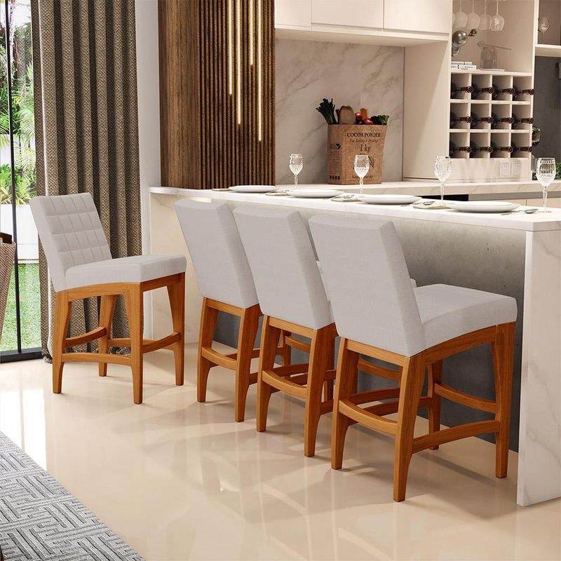 Entregando muita excelência, o Kit 05 Banquetas Baixa Para Cozinha Bancada Bar Sala De Jantar 90 cm Fixa Mila L02 Linho Bege - Lyam Decor é o complemento que faltava para deixar sua casa ainda mais extraordinária. Seu encosto com costura em padrão quadriculado e assento estofados, centralizam em si uma graciosidade estonteante, sem perder todo o seu conforto. A estrutura em madeira, na cor nozes, também é digna de notoriedade, por imprimir bastante personalidade a sua decoração. Vale ressaltar ainda, o apoio para os pés que garante maior segurança à mesma. Pode ser acomodada em cozinha americana, ambientes integrados, espaços gourmets, bancadas ou em seu home bar, independente do lugar, ela desperta logo de cara bastante elegância e deixa tudo mais despojado, perfeita para criar um ambiente harmonioso e agradável para receber a família e amigos, quando favorável. Características: Estrutura em madeira de reflorestamento de eucalipto vermelho tratado. Revestimento em Linho Bege de alta qualidade. Assento com espuma D-28. Encosto com espuma D-28. Peso suportado: Até 130 kg. Estrutura de Madeira na cor Nozes. Dimensões do produto (L x A x P) 38 x 90 x 46,5 cm Altura do chão ao assento: 60 cm Altura do encosto: 34 cm Profundidade do assento: 34 cm Largura do assento: 40 cm - Por se tratar de estofado as medidas podem ter uma pequena variação de até 3 cm. - A tonalidade do produto real poderá ter ligeira variação devido o lote de tecidos. Observações importantes: - Produto para uso residencial em ambiente interno, não devendo ficar exposto diretamente ao sol, calor e umidade excessivos. - Pode haver alguma diferença de tonalidade entre a imagem e o produto real, por conta do tratamento de imagens e a calibração de cores do seu monitor. - As imagens são meramente ilustrativas, não acompanham objetos de decoração e eletrônicos. - Ao receber a mercadoria, o cliente deve verificar as condições da embalagem, caso haja alguma avaria não assine o comprovante de recebimento. - Montagem, desmontagem e outras instalações serão de responsabilidade do cliente. Não nos responsabilizamos, no ato da entrega, por subir escadas/elevadores ou pelo transporte por guincho em apartamentos. Eventuais despesas são de responsabilidade do comprador. - Confira as dimensões do produto e certifique-se de que passará normalmente por supostos elevadores, portas, escadas e/ou corredores de sua residência.