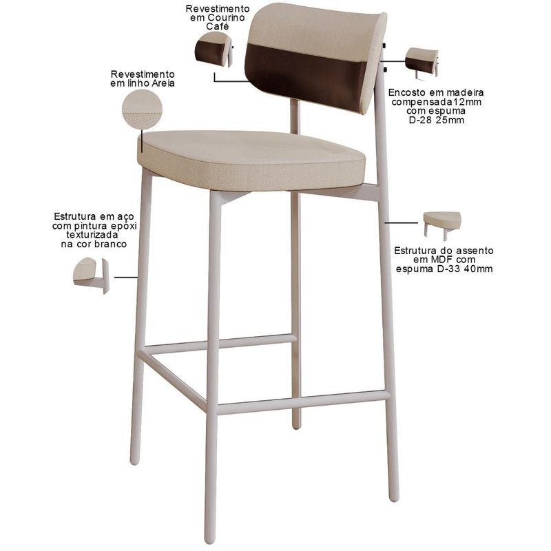 Transforme sua área gourmet com a Banqueta Kaira! Desfrute de momentos inesquecíveis desfrutando do conforto da Banqueta Kaira, projetada para oferecer o máximo de conforto e elegância na sua sala de jantar ou cozinha. Com encosto curvo, ofertando maior conforto no uso, e assento estofado com uma espuma de altíssima qualidade, ela proporciona suporte ideal para longas refeições e conversas agradáveis. Além de combinar durabilidade e estilo, ela é a escolha perfeita para quem busca sofisticação e bem-estar em cada detalhe. Aproveite! Dimensões da Banqueta (L x A x P) 44,2 x 103,5 x 44 cm Altura do chão ao assento: 76,2 Altura do encosto: 21 Características: Estrutura fixa em aço carbono com pintura epóxi na cor branco. Encosto produzido em madeira compensada com espuma D-28, 25mm. Assento produzido em MDF com espuma D-33, 40mm. Revestimento em Linho Areia Courino Café. Peso suportado de até 120 kg. Produto entregue desmontado, acompanha manual de montagem. - Por se tratar de estofado as medidas podem ter uma pequena variação de até 3 cm. - A tonalidade do produto real poderá ter ligeira variação devido o lote de tecidos. - A limpeza deve ser feita com pano levemente umedecido em água limpa, sem esfregar, não utilizar produtos abrasivos, desengordurantes, álcool ou solvente. Observações importantes: - Produto para uso residencial em ambiente interno, não devendo ficar exposto diretamente ao sol, calor e umidade excessivos. - Pode haver alguma diferença de tonalidade entre a imagem e o produto real, por conta do tratamento de imagens e a calibração de cores do seu monitor. - As imagens são meramente ilustrativas, não acompanham objetos de decoração e eletrônicos. - Ao receber a mercadoria, o cliente deve verificar as condições da embalagem, caso haja alguma avaria não assine o comprovante de recebimento. - Montagem, desmontagem e outras instalações serão de responsabilidade do cliente. Não nos responsabilizamos, no ato da entrega, por subir escadas/elevadores ou pelo transporte por guincho em apartamentos. Eventuais despesas são de responsabilidade do comprador. - Confira as dimensões do produto e certifique-se de que passará normalmente por supostos elevadores, portas, escadas e/ou corredores de sua residência.
