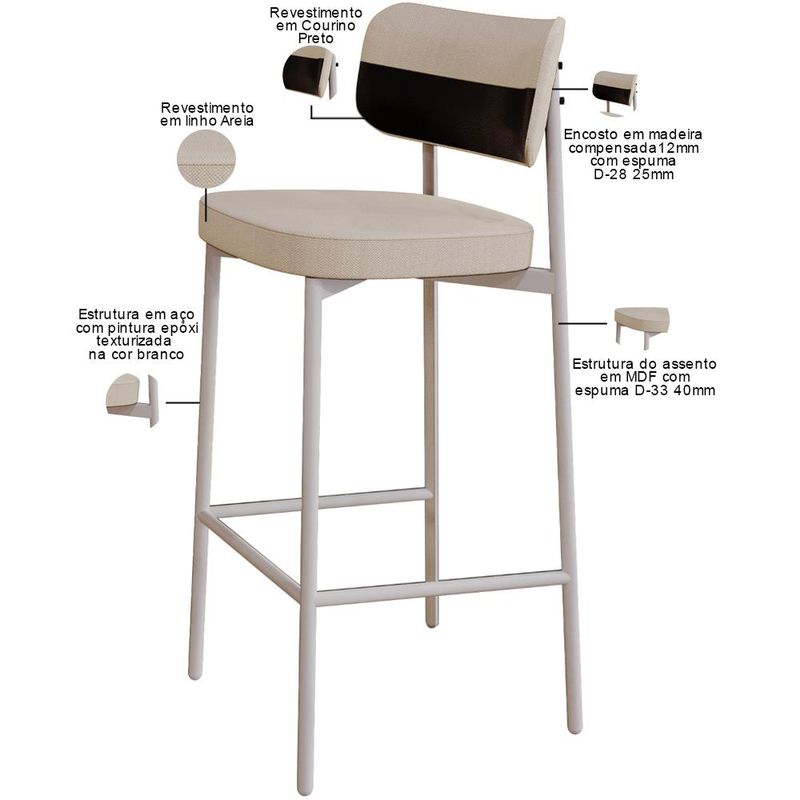 Transforme sua área gourmet com a Banqueta Kaira! Desfrute de momentos inesquecíveis desfrutando do conforto da Banqueta Kaira, projetada para oferecer o máximo de conforto e elegância na sua sala de jantar ou cozinha. Com encosto curvo, ofertando maior conforto no uso, e assento estofado com uma espuma de altíssima qualidade, ela proporciona suporte ideal para longas refeições e conversas agradáveis. Além de combinar durabilidade e estilo, ela é a escolha perfeita para quem busca sofisticação e bem-estar em cada detalhe. Aproveite! Dimensões da Banqueta (L x A x P) 44,2 x 103,5 x 44 cm Altura do chão ao assento: 76,2 Altura do encosto: 21 Características: Estrutura fixa em aço carbono com pintura epóxi na cor branco. Encosto produzido em madeira compensada com espuma D-28, 25mm. Assento produzido em MDF com espuma D-33, 40mm. Revestimento em Linho Areia Courino Preto. Peso suportado de até 120 kg. Produto entregue desmontado, acompanha manual de montagem. - Por se tratar de estofado as medidas podem ter uma pequena variação de até 3 cm. - A tonalidade do produto real poderá ter ligeira variação devido o lote de tecidos. - A limpeza deve ser feita com pano levemente umedecido em água limpa, sem esfregar, não utilizar produtos abrasivos, desengordurantes, álcool ou solvente. Observações importantes: - Produto para uso residencial em ambiente interno, não devendo ficar exposto diretamente ao sol, calor e umidade excessivos. - Pode haver alguma diferença de tonalidade entre a imagem e o produto real, por conta do tratamento de imagens e a calibração de cores do seu monitor. - As imagens são meramente ilustrativas, não acompanham objetos de decoração e eletrônicos. - Ao receber a mercadoria, o cliente deve verificar as condições da embalagem, caso haja alguma avaria não assine o comprovante de recebimento. - Montagem, desmontagem e outras instalações serão de responsabilidade do cliente. Não nos responsabilizamos, no ato da entrega, por subir escadas/elevadores ou pelo transporte por guincho em apartamentos. Eventuais despesas são de responsabilidade do comprador. - Confira as dimensões do produto e certifique-se de que passará normalmente por supostos elevadores, portas, escadas e/ou corredores de sua residência.