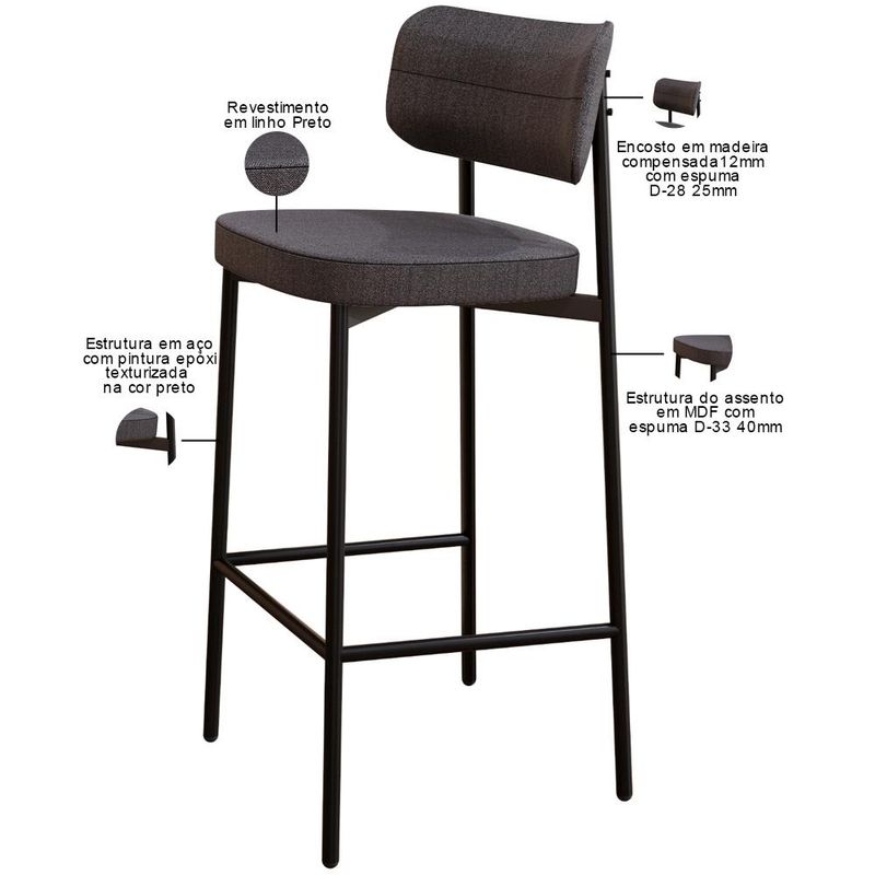 Transforme sua área gourmet com a Banqueta Kaira! Desfrute de momentos inesquecíveis desfrutando do conforto da Banqueta Kaira, projetada para oferecer o máximo de conforto e elegância na sua sala de jantar ou cozinha. Com encosto curvo, ofertando maior conforto no uso, e assento estofado com uma espuma de altíssima qualidade, ela proporciona suporte ideal para longas refeições e conversas agradáveis. Além de combinar durabilidade e estilo, ela é a escolha perfeita para quem busca sofisticação e bem-estar em cada detalhe. Aproveite! Dimensões da Banqueta (L x A x P) 44,2 x 103,5 x 44 cm Altura do chão ao assento: 76,2 Altura do encosto: 21 Características: Estrutura fixa em aço carbono com pintura epóxi na cor preto. Encosto produzido em madeira compensada com espuma D-28, 25mm. Assento produzido em MDF com espuma D-33, 40mm. Revestimento em Linho Preto. Peso suportado de até 120 kg. Produto entregue desmontado, acompanha manual de montagem. - Por se tratar de estofado as medidas podem ter uma pequena variação de até 3 cm. - A tonalidade do produto real poderá ter ligeira variação devido o lote de tecidos. - A limpeza deve ser feita com pano levemente umedecido em água limpa, sem esfregar, não utilizar produtos abrasivos, desengordurantes, álcool ou solvente. Observações importantes: - Produto para uso residencial em ambiente interno, não devendo ficar exposto diretamente ao sol, calor e umidade excessivos. - Pode haver alguma diferença de tonalidade entre a imagem e o produto real, por conta do tratamento de imagens e a calibração de cores do seu monitor. - As imagens são meramente ilustrativas, não acompanham objetos de decoração e eletrônicos. - Ao receber a mercadoria, o cliente deve verificar as condições da embalagem, caso haja alguma avaria não assine o comprovante de recebimento. - Montagem, desmontagem e outras instalações serão de responsabilidade do cliente. Não nos responsabilizamos, no ato da entrega, por subir escadas/elevadores ou pelo transporte por guincho em apartamentos. Eventuais despesas são de responsabilidade do comprador. - Confira as dimensões do produto e certifique-se de que passará normalmente por supostos elevadores, portas, escadas e/ou corredores de sua residência.