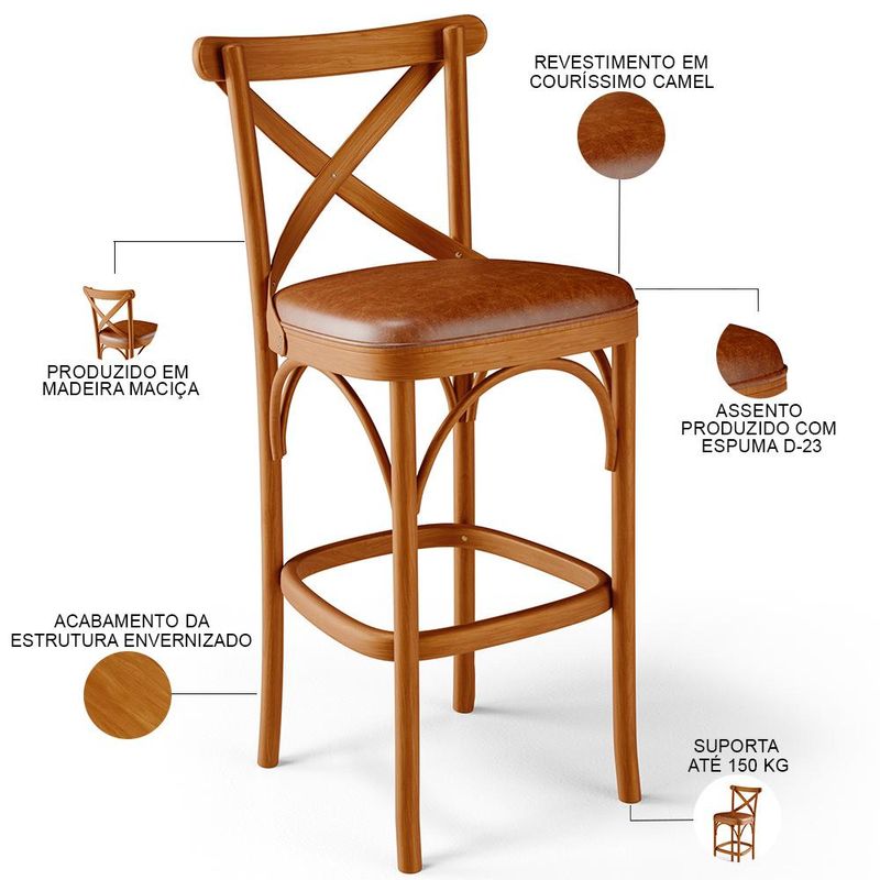 As banquetas têm ocupado um papel de destaque na decoração qualquer ambiente, pensando nisso a Banqueta Ávila chega trazendo um design moderno, confortável e prático. Seu assento estofado traz charme e entrega o conforto ideal a você e sua família. Quando o assunto é versatilidade, ela se propõe a agradar todos os estilos e se encaixar em bares, áreas gourmet, bancadas, cozinhas, salas de jantar e estar e até restaurantes. Sua estrutura em madeira maciça, garante segurança e ainda adiciona toques de elegância e harmonia ao seu espaço. Garanta estilo ao seu ambiente e adquira já a sua!! Dimensões do produto (L x A x P) 50 x 103 x 56 cm Medidas Internas: Altura do encosto: 30 cm Altura do chão ao assento: 77 cm Largura do assento: 44 cm Profundidade do assento: 43 cm Largura total do encosto: 50 cm Altura do chão ao apoio de pés: 29,5 cm Largura do encosto: 36,5 cm Características: Estrutura em Madeira Maciça, com acabamento envernizado. Revestimento em Couríssimo na cor Camel, de alta qualidade. Assento estofado com espuma D-23. Suporta até 150 kg. - Produto entregue montado. - Por se tratar de estofado as medidas podem ter uma pequena variação de até 3 cm. - A tonalidade do produto real poderá ter ligeira variação devido o lote de tecidos. - A limpeza deve ser feita com pano umedecido em água limpa, sem esfregar, não utilizar produtos abrasivos, desengordurantes, álcool ou solvente. Observações importantes: - Produto para uso residencial em ambiente interno, não devendo ficar exposto diretamente ao sol, calor e umidade excessivos. - Pode haver alguma diferença de tonalidade entre a imagem e o produto real, por conta do tratamento de imagens e a calibração de cores do seu monitor. - As imagens são meramente ilustrativas, não acompanham objetos de decoração e eletrônicos. - Ao receber a mercadoria, o cliente deve verificar as condições da embalagem, caso haja alguma avaria não assine o comprovante de recebimento. - Montagem, desmontagem e outras instalações serão de responsabilidade do cliente. Não nos responsabilizamos, no ato da entrega, por subir escadas/elevadores ou pelo transporte por guincho em apartamentos. Eventuais despesas são de responsabilidade do comprador. - Confira as dimensões do produto e certifique-se de que passará normalmente por supostos elevadores, portas, escadas e/ou corredores de sua residência.