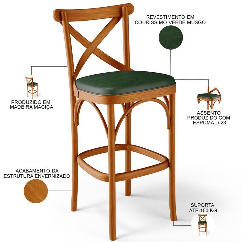 As banquetas têm ocupado um papel de destaque na decoração qualquer ambiente, pensando nisso a Banqueta Ávila chega trazendo um design moderno, confortável e prático. Seu assento estofado traz charme e entrega o conforto ideal a você e sua família. Quando o assunto é versatilidade, ela se propõe a agradar todos os estilos e se encaixar em bares, áreas gourmet, bancadas, cozinhas, salas de jantar e estar e até restaurantes. Sua estrutura em madeira maciça, garante segurança e ainda adiciona toques de elegância e harmonia ao seu espaço. Garanta estilo ao seu ambiente e adquira já a sua!! Dimensões do produto (L x A x P) 50 x 103 x 56 cm Medidas Internas: Altura do encosto: 30 cm Altura do chão ao assento: 77 cm Largura do assento: 44 cm Profundidade do assento: 43 cm Largura total do encosto: 50 cm Altura do chão ao apoio de pés: 29,5 cm Largura do encosto: 36,5 cm Características: Estrutura em Madeira Maciça, com acabamento envernizado. Revestimento em Couríssimo na cor Verde Musgo, de alta qualidade. Assento estofado com espuma D-23. Suporta até 150 kg. - Produto entregue montado. - Por se tratar de estofado as medidas podem ter uma pequena variação de até 3 cm. - A tonalidade do produto real poderá ter ligeira variação devido o lote de tecidos. - A limpeza deve ser feita com pano umedecido em água limpa, sem esfregar, não utilizar produtos abrasivos, desengordurantes, álcool ou solvente. Observações importantes: - Produto para uso residencial em ambiente interno, não devendo ficar exposto diretamente ao sol, calor e umidade excessivos. - Pode haver alguma diferença de tonalidade entre a imagem e o produto real, por conta do tratamento de imagens e a calibração de cores do seu monitor. - As imagens são meramente ilustrativas, não acompanham objetos de decoração e eletrônicos. - Ao receber a mercadoria, o cliente deve verificar as condições da embalagem, caso haja alguma avaria não assine o comprovante de recebimento. - Montagem, desmontagem e outras instalações serão de responsabilidade do cliente. Não nos responsabilizamos, no ato da entrega, por subir escadas/elevadores ou pelo transporte por guincho em apartamentos. Eventuais despesas são de responsabilidade do comprador. - Confira as dimensões do produto e certifique-se de que passará normalmente por supostos elevadores, portas, escadas e/ou corredores de sua residência.