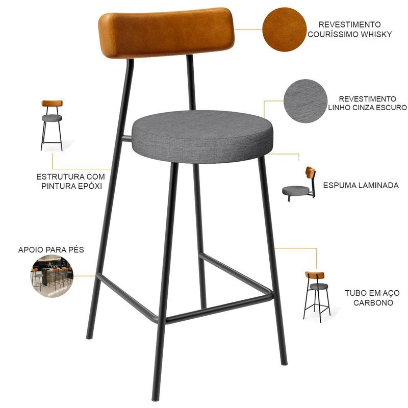 Amplamente moderna, dispondo de muito realce e design singular, o Kit 06 Banquetas Baixa Para Cozinha Sala De Jantar Bar Bancada Milão L02 Couríssimo Whisky Linho Cinza Escuro - Lyam Decor vem com a personalidade e elegância que sua decoração merece! Estruturada em aço carbono, contrasta lindamente com o encosto e assento estofados, cabe mencionar ainda seu revestimento em Couríssimo, é confeccionada por materiais de excelente qualidade, extremamente resistentes e aconchegantes. Possui altura ideal, garantindo o encaixe perfeito no ambiente, otimizando seu espaço e promovendo máximo conforto. Pode ser disposta em bancada, cozinha americana, área gourmet ou home bar, as possibilidades são infinitas e as combinações ficarão perfeitas. Adquira já a sua!! Dimensões do Produto (L x A x P) 44 x 84 x 52 cm Medidas Internas: Altura do chão ao assento: 65 cm Altura do chão ao apoio para pés: 20 cm Altura do assento ao encosto: 20 cm Altura do assento: 6 cm Largura do assento: 35 cm Largura do encosto: 38 cm Profundidade do encosto: 4,5 cm Características: Encosto e assento estofados com espuma laminada. Revestimento Encosto em Couríssimo na cor Whisky e Assento em Linho na cor Cinza Escuro de alta qualidade. Estrutura fixa em aço carbono com pintura epóxi na cor preto. Pés com ponteiras plásticas, que permitem maior resistência e qualidade sem riscar o piso. Peso suportado de até 120 kg. Produto entregue desmontado, acompanha manual de montagem. - Por se tratar de estofado as medidas podem ter uma pequena variação de até 3 cm. - A tonalidade do produto real poderá ter ligeira variação devido o lote de tecidos. - A limpeza deve ser feita com pano levemente umedecido em água limpa, sem esfregar, não utilizar produtos abrasivos, desengordurantes, álcool ou solvente. Observações importantes: - Produto para uso residencial em ambiente interno, não devendo ficar exposto diretamente ao sol, calor e umidade excessivos. - Pode haver alguma diferença de tonalidade entre a imagem e o produto real, por conta do tratamento de imagens e a calibração de cores do seu monitor. - As imagens são meramente ilustrativas, não acompanham objetos de decoração e eletrônicos. - Ao receber a mercadoria, o cliente deve verificar as condições da embalagem, caso haja alguma avaria não assine o comprovante de recebimento. - Montagem, desmontagem e outras instalações serão de responsabilidade do cliente. Não nos responsabilizamos, no ato da entrega, por subir escadas/elevadores ou pelo transporte por guincho em apartamentos. Eventuais despesas são de responsabilidade do comprador. - Confira as dimensões do produto e certifique-se de que passará normalmente por supostos elevadores, portas, escadas e/ou corredores de sua residência.