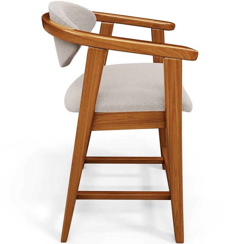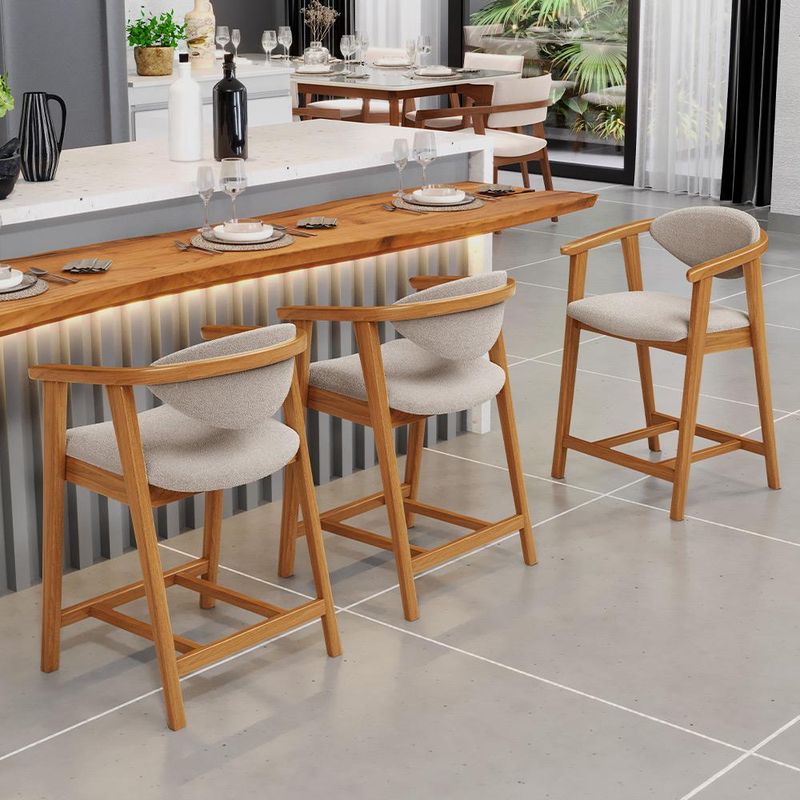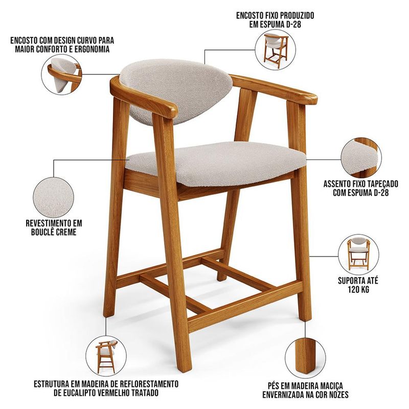 Crie um ambiente sofisticado e acolhedor com o Kit 06 Banquetas Baixa Cecília, da Lyam Decor. Com design moderno essa banqueta é uma peça muito versátil, pois você pode aproveitá-la em diversos ambientes, desde cozinha, sala de jantar, bancada até a área gourmet ou bar e, assim, agregar o máximo de beleza e conforto. Afinal, essa banqueta de madeira se destaca pela sua estrutura robusta que resistência e durabilidade. Já o assento estofado oferece o máximo conforto, enquanto o encosto proporciona suporte ergonômico sem igual. Combinando elegância e praticidade, essa banqueta baixa com encosto é perfeita para quem deseja um toque de requinte em qualquer ambiente. Adicione um charme especial ao seu lar com essa peça indispensável. Adicione ao seu carrinho e desfrute momentos de alegria com a Banqueta Cecília! Dimensões da Banqueta (L x A x P) 51 x 90 x 47 cm Medidas Internas: Altura do chão ao assento: 60 cm Assento livre (L x A x P): 44 x 4,5 x 46,5 cm Encosto livre (L x A): 41 x 22 cm Altura total do encosto: 33 cm Altura interna do braço: 18 cm Altura do chão ao início do braço: 76 cm Altura do chão ao apoio de pés: 17 cm Largura interna do apoio de pés: 27 cm Altura do apoio de pés: 4,5 cm Características: Estrutura em madeira de reflorestamento de eucalipto vermelho tratado. Revestimento em tecido Bouclê de alta qualidade na cor Creme. Assento e encosto fixos tapeçados com espuma D-28. Encosto com design curvo para maior conforto e ergonomia. Pés em madeira maciça envernizada na cor Nozes. Peso suportado: Até 120 kg. - Nunca sentar nos braços ou encosto do produto. - Por se tratar de estofado as medidas podem ter uma pequena variação de até 3 cm. - A tonalidade do produto real poderá ter ligeira variação devido o lote de tecidos. - Indicado para uso residencial, sua limpeza deve ser feita com pano levemente umedecido em água limpa, sem esfregar, não utilizar produtos abrasivos, desengordurantes, álcool ou solvente. Observações importantes: - Produto para uso residencial em ambiente interno, não devendo ficar exposto diretamente ao sol, calor e umidade excessivos. - Pode haver alguma diferença de tonalidade entre a imagem e o produto real, por conta do tratamento de imagens e a calibração de cores do seu monitor. - As imagens são meramente ilustrativas, não acompanham objetos de decoração e eletrônicos. - Ao receber a mercadoria, o cliente deve verificar as condições da embalagem, caso haja alguma avaria não assine o comprovante de recebimento e entre em contato com nossa loja para orientações. - Montagem, desmontagem e outras instalações serão de responsabilidade do cliente. Não nos responsabilizamos, no ato da entrega, por subir escadas/elevadores ou pelo transporte por guincho em apartamentos. Eventuais despesas são de responsabilidade do comprador. - Confira as dimensões do produto e certifique-se de que passará normalmente por supostos elevadores, portas, escadas e/ou corredores de sua residência. - Para mais informações, acesse nossa Central de Atendimento.