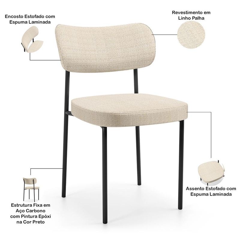 Caso você esteja buscando conforto, realce e praticidade, o Kit 06 Cadeiras Estofada Melina vai superar todas as suas expectativas. Garante muita comodidade e otimiza o espaço, além de harmonizar com seu estilo decorativo facilmente, podendo ser utilizada em salas de estar, jantar e cozinha, além de dar um toque especial em sua decoração. Sua proposta de design suavizará seu ambiente sem passar despercebida oferecendo mais leveza e receptividade ao seu lar. Estruturada em aço carbono, contrasta lindamente com o encosto e assento estofados que são extremamente confortáveis, resistentes e aconchegantes. Você merece esta incrível combinação em sua casa, adquira já a sua! Dimensões da Cadeira (L x A x P) 49 x 77 x 54 cm Medidas Internas: Altura do encosto: 22 cm Largura do encosto: 49 cm Altura do assento ao encosto: 34 cm Altura do assento: 6,5 cm Largura do assento: 44 cm Profundidade do assento: 45 cm Altura do chão ao assento: 49 cm Características: Encosto e assento estofados com espuma laminada. Estrutura fixa em aço carbono com pintura epóxi na cor preto. Revestimento em Linho na cor Palha. Suporta até 120 kg. - Por se tratar de estofado as medidas podem ter uma pequena variação de até 3 cm. - A tonalidade do produto real poderá ter ligeira variação devido o lote de tecidos. - A limpeza deve ser feita com pano levemente umedecido em água limpa, sem esfregar, não utilizar produtos abrasivos, desengordurantes, álcool ou solvente. Observações importantes: - Produto para uso residencial em ambiente interno, não devendo ficar exposto diretamente ao sol, calor e umidade excessivos. - Pode haver alguma diferença de tonalidade entre a imagem e o produto real, por conta do tratamento de imagens e a calibração de cores do seu monitor. - As imagens são meramente ilustrativas, não acompanham objetos de decoração e eletrônicos. - Ao receber a mercadoria, o cliente deve verificar as condições da embalagem, caso haja alguma avaria não assine o comprovante de recebimento. - Montagem, desmontagem e outras instalações serão de responsabilidade do cliente. Não nos responsabilizamos, no ato da entrega, por subir escadas/elevadores ou pelo transporte por guincho em apartamentos. Eventuais despesas são de responsabilidade do comprador. - Confira as dimensões do produto e certifique-se de que passará normalmente por supostos elevadores, portas, escadas e/ou corredores de sua residência.