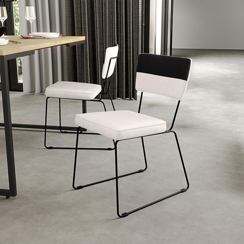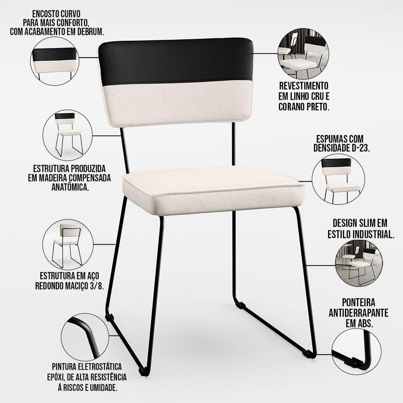 O espetáculo que é o Kit 06 Cadeiras Decorativas Estofada Allana L02 Faixa Corano Preto Linho Cru - Lyam Decor vem para agregar ainda mais valor na decoração da sua casa. Sua estrutura em aço remete-nos ao estilo industrial que surgiu em Nova York no século XX, já o assento e encosto estofados trazem equilíbrio e conforto criando a combinação perfeita para o ambiente. Podendo ser disposta em salas de jantar e estar, cozinha, espaço gourmet, dentre outras opções, se destaca com muita elegância e presença. Conta com materiais de máxima qualidade e está sempre pronta para recepcionar família e amigos de forma agradável. Você e seu lar merecem, aproveite!! Dimensões da Cadeira (L x A x P) 45 x 76 x 55 cm Medidas Internas: Altura do Assento ao chão: 45 cmLargura do assento: 40 cmProfundidade do assento: 39 cmAltura do assento: 06 cmAltura do encosto: 23 cmLargura do encosto: 39 cmAltura do assento ao encosto: 37 cmLargura traseira dos pés: 37 cm Características:Estrutura em madeira compensada anatômica.Estrutura de aço redondo maciço 3/8 polegadas, com ponteira antiderrapante em abs.Pintura eletrostática epóxi de alta resistência à riscos e umidade, na cor preto.Assento e encosto com espuma D-23 e acabamento em Debrum.Revestimento do encosto em Corano Preto de alta qualidade.Revestimento do assento em Linho Cru de alta qualidade.Peso suportado: Até 100 kg. - Por se tratar de estofado as medidas podem ter uma pequena variação de até 3 cm. - A tonalidade do produto real poderá ter ligeira variação devido o lote de tecidos. - A limpeza deve ser feita com pano levemente umedecido em água limpa, sem esfregar, não utilizar produtos abrasivos, desengordurantes, álcool ou solvente. Observações importantes: - Produto para uso residencial em ambiente interno, não devendo ficar exposto diretamente ao sol, calor e umidade excessivos. - Pode haver alguma diferença de tonalidade entre a imagem e o produto real, por conta do tratamento de imagens e a calibração de cores do seu monitor. - As imagens são meramente ilustrativas, não acompanham objetos de decoração e eletrônicos. - Ao receber a mercadoria, o cliente deve verificar as condições da embalagem, caso haja alguma avaria não assine o comprovante de recebimento. - Montagem, desmontagem e outras instalações serão de responsabilidade do cliente. Não nos responsabilizamos, no ato da entrega, por subir escadas/elevadores ou pelo transporte por guincho em apartamentos. Eventuais despesas são de responsabilidade do comprador. - Confira as dimensões do produto e certifique-se de que passará normalmente por supostos elevadores, portas, escadas e/ou corredores de sua residência.