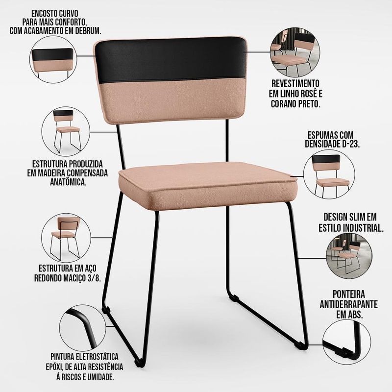 O espetáculo que é o Kit 06 Cadeiras Decorativas Estofada Allana L02 Faixa Corano Preto Linho Rosê - Lyam Decor vem para agregar ainda mais valor na decoração da sua casa. Sua estrutura em aço remete-nos ao estilo industrial que surgiu em Nova York no século XX, já o assento e encosto estofados trazem equilíbrio e conforto criando a combinação perfeita para o ambiente. Podendo ser disposta em salas de jantar e estar, cozinha, espaço gourmet, dentre outras opções, se destaca com muita elegância e presença. Conta com materiais de máxima qualidade e está sempre pronta para recepcionar família e amigos de forma agradável. Você e seu lar merecem, aproveite!! Dimensões da Cadeira (L x A x P) 45 x 76 x 55 cm Medidas Internas: Altura do Assento ao chão: 45 cmLargura do assento: 40 cmProfundidade do assento: 39 cmAltura do assento: 06 cmAltura do encosto: 23 cmLargura do encosto: 39 cmAltura do assento ao encosto: 37 cmLargura traseira dos pés: 37 cm Características:Estrutura em madeira compensada anatômica.Estrutura de aço redondo maciço 3/8 polegadas, com ponteira antiderrapante em abs.Pintura eletrostática epóxi de alta resistência à riscos e umidade, na cor preto.Assento e encosto com espuma D-23 e acabamento em Debrum.Revestimento do encosto em Corano Preto de alta qualidade.Revestimento do assento em Linho Rosê de alta qualidade.Peso suportado: Até 100 kg. - Por se tratar de estofado as medidas podem ter uma pequena variação de até 3 cm. - A tonalidade do produto real poderá ter ligeira variação devido o lote de tecidos. - A limpeza deve ser feita com pano levemente umedecido em água limpa, sem esfregar, não utilizar produtos abrasivos, desengordurantes, álcool ou solvente. Observações importantes: - Produto para uso residencial em ambiente interno, não devendo ficar exposto diretamente ao sol, calor e umidade excessivos. - Pode haver alguma diferença de tonalidade entre a imagem e o produto real, por conta do tratamento de imagens e a calibração de cores do seu monitor. - As imagens são meramente ilustrativas, não acompanham objetos de decoração e eletrônicos. - Ao receber a mercadoria, o cliente deve verificar as condições da embalagem, caso haja alguma avaria não assine o comprovante de recebimento. - Montagem, desmontagem e outras instalações serão de responsabilidade do cliente. Não nos responsabilizamos, no ato da entrega, por subir escadas/elevadores ou pelo transporte por guincho em apartamentos. Eventuais despesas são de responsabilidade do comprador. - Confira as dimensões do produto e certifique-se de que passará normalmente por supostos elevadores, portas, escadas e/ou corredores de sua residência.