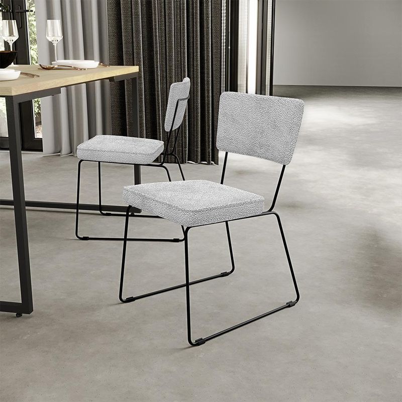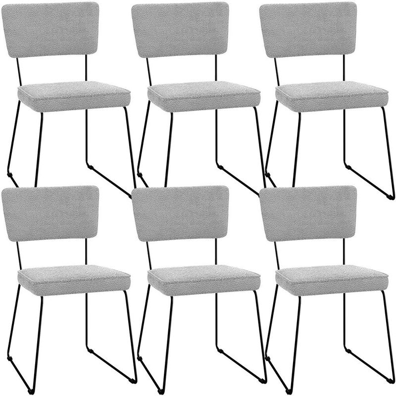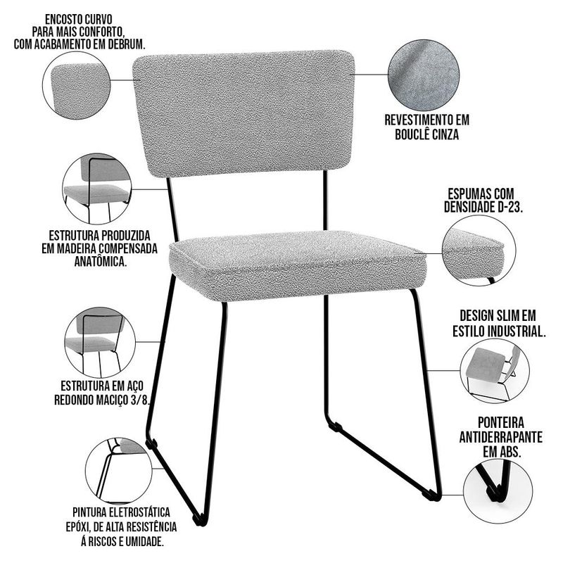 O espetáculo que é o KIt 06 Cadeiras Decorativas Estofada Para Sala De Jantar Base Em Aço Allana L02 Bouclê Cinza - Lyam Decor vem para agregar ainda mais valor na decoração da sua casa. Sua estrutura em aço remete-nos ao estilo industrial que surgiu em Nova York no século XX, já o assento e encosto estofados trazem equilíbrio e conforto criando a combinação perfeita para o ambiente. Cabe mencionar também o revestimento em bouclê que possui textura incrível e acabamento impecável. Podendo ser disposta em salas de jantar, cozinha ou espaço gourmet, dentre outras opções, se destaca com muita elegância e presença. Conta com materiais de máxima qualidade e está sempre pronta para recepcionar família e amigos de forma agradável. Você e seu lar merecem, aproveite!! Dimensões da Cadeira (L x A x P) 45 x 76 x 55 cm Medidas Internas: Altura do Assento ao chão: 45 cm Largura do assento: 40 cm Profundidade do assento: 39 cm Altura do assento: 6 cm Altura do encosto: 23 cm Largura do encosto: 39 cm Altura do assento ao encosto: 37 cm Largura traseira dos pés: 37 cm Características: Estrutura em madeira compensada anatômica. Estrutura de aço redondo maciço 3/8 polegadas, com ponteira antiderrapante em abs. Pintura eletrostática epóxi de alta resistência à riscos e umidade, na cor preto. Assento e encosto com espuma D-23 e acabamento em Debrum. Revestimento em Bouclê na cor Cinza. Peso suportado: Até 100 kg. - Produto entregue desmontado. - Por se tratar de estofado as medidas podem ter uma pequena variação de até 3 cm. - A tonalidade do produto real poderá ter ligeira variação devido o lote de tecidos. - A limpeza deve ser feita com pano levemente umedecido em água limpa, sem esfregar, não utilizar produtos abrasivos, desengordurantes, álcool ou solvente. Observações importantes: - Produto para uso residencial em ambiente interno, não devendo ficar exposto diretamente ao sol, calor e umidade excessivos. - Pode haver alguma diferença de tonalidade entre a imagem e o produto real, por conta do tratamento de imagens e a calibração de cores do seu monitor. - As imagens são meramente ilustrativas, não acompanham objetos de decoração e eletrônicos. - Ao receber a mercadoria, o cliente deve verificar as condições da embalagem, caso haja alguma avaria não assine o comprovante de recebimento. - Montagem, desmontagem e outras instalações serão de responsabilidade do cliente. Não nos responsabilizamos, no ato da entrega, por subir escadas/elevadores ou pelo transporte por guincho em apartamentos. Eventuais despesas são de responsabilidade do comprador. - Confira as dimensões do produto e certifique-se de que passará normalmente por supostos elevadores, portas, escadas e/ou corredores de sua residência.