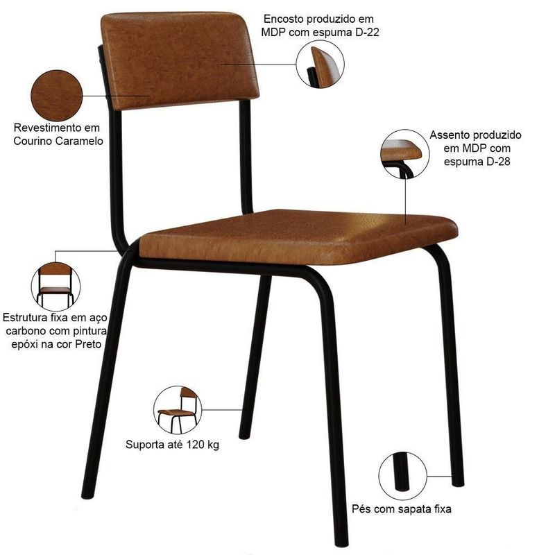 Kit 06 Cadeiras Estofada Para Sala De Jantar Sense Preto C01 Courino Caramelo - Lyam DecorDesfrute de momentos inesquecíveis com a Cadeira Sense, projetada para oferecer o máximo de conforto e elegância com seu design slim. Com sua estrutura de aço, assento e encosto estofados com materiais de altíssima qualidade, ela proporciona suporte ideal para longas refeições e conversas agradáveis. Além de combinar durabilidade e estilo, ela é a escolha perfeita para quem busca sofisticação e bem-estar em cada detalhe. Transforme sua sala de jantar com a nossa Cadeira Sense. Garanta já a sua!Dimensões da Cadeira (L x A x P) 47,5 x 81 x 50,5 cmAltura do chão ao assento: 47,5 cm Largura do encosto: 41 cm Altura do encosto: 17 cm Profundidade do assento: 40 cmCaracterísticas: Estrutura fixa em aço carbono com pintura epóxi na cor preto. Encosto produzido em MDP com espuma D-22. Assento produzido em MDP com espuma D-28. Revestimento em Courino Caramelo. Pés com sapatas fixa. Peso suportado de até 120 kg.- Por se tratar de estofado as medidas podem ter uma pequena variação de até 3 cm. - A tonalidade do produto real poderá ter ligeira variação devido o lote de tecidos. - A limpeza deve ser feita com pano levemente umedecido em água limpa, sem esfregar, não utilizar produtos abrasivos, desengordurantes, álcool ou solvente.Observações importantes: - Produto para uso residencial em ambiente interno, não devendo ficar exposto diretamente ao sol, calor e umidade excessivos. - Pode haver alguma diferença de tonalidade entre a imagem e o produto real, por conta do tratamento de imagens e a calibração de cores do seu monitor. - As imagens são meramente ilustrativas, não acompanham objetos de decoração e eletrônicos. - Ao receber a mercadoria, o cliente deve verificar as condições da embalagem, caso haja alguma avaria não assine o comprovante de recebimento. - Montagem, desmontagem e outras instalações serão de responsabilidade do cliente. Não nos responsabilizamos, no ato da entrega, por subir escadas/elevadores ou pelo transporte por guincho em apartamentos. Eventuais despesas são de responsabilidade do comprador. - Confira as dimensões do produto e certifique-se de que passará normalmente por supostos elevadores, portas, escadas e/ou corredores de sua residência. Cor do estofamento: Caramelo | ProductLength: 51 cm | SizeDescription: Altura: 243 cm x Largura: 48 cm x Profundidade: 51 cm | ProductWeight: 33,4 Kg | É empilhável: Não | Requer montagem: Não | Cor: Caramelo | ColorFamily: Caramelo | ColorSimple: Caramelo | Fabricante: Lyam Decor | Material: Estrutura em Aço e MDP, Revestimento em Couro sintético | MaterialFamily: Aço, MDP e Couro sintético | Model: Sense | OriginCountry: Brasil | OriginState: PR | ProductContents: 06 Cadeiras | SupplierSimpleName: Kit 06 Cadeiras Estofada Para Sala de Jantar Sense Preto C01 Courino Caramelo - Lyam Decor | ProductWidth: 48 cm | ProductHeight: 243 cm | ProductInstructions: Produto para uso em ambiente interno, nao devendo ficar exposto ao sol, calor e umidade excessivos. | Desenho do tecido: Liso | Cor do assento: Caramelo | Cor da estrutura da cadeira: Preto | Color: Caramelo | ColorSupplier: Caramelo | ProductWarranty: 90 dias após o recebimento do produto | Material do estofamento: Aço, MDP e Couro sintético | Profundidade da cadeira: 51 cm | Peso máximo suportado: 120 kg | Espessura do assento: na | É cadeira de balanço: Não | Largura do assento: NA | Largura da cadeira: 47,5 cm | Profundidade do assento: 40 cm | Altura da cadeira: 81 cm | Firmeza: Firme | Altura do assento a partir do solo: 47,5 cm | É dobrável: Não | Tempo de montagem: na