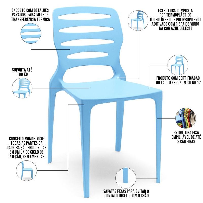 O Kit 06 Cadeiras Empilhável Larsen, da Lyam Decor, é o jogo de cadeiras perfeito que une estilo e praticidade para o seu dia a dia! Desenvolvida com a mais alta tecnologia, essa cadeira é a escolha perfeita para quem busca um móvel versátil, durável e com um design moderno. Fabricada em termoplástico aditivado com fibra de vidro, ela oferece alta resistência e durabilidade, suportando o uso intenso em diversos ambientes. Seja como cadeira para cozinha, área gourmet ou até mesmo para salão de festas ou refeitórios, essa cadeira polipropileno é perfeita para todos os espaços. Sem contar que o desenho moderno vai adicionar um toque de estilo e personalidade, ao passo que a opção de empilhamento vai otimizar a área de circulação. Leve mais versatilidade para os seus dias com a Cadeira Larsen e surpreenda-se! Dimensões da Cadeira (L x A x P) 43,7 x 83,6 x 52,3 cm Medidas Internas: Encosto (L x A): 39,5 x 31,3 cm Altura do chão ao assento: 45,5 cm Profundidade entre os pés: 48,3 cm Características: Estrutura composta por termoplástico (Copolímero de Polipropileno) aditivado com fibra de vidro na cor Azul Celeste. Conceito monobloco: todas as partes da cadeira são produzidas em um único ciclo de injeção, sem emendas. Encosto com detalhes vazados, para melhor transferência térmica. Sapatas fixas para evitar o contato direto com o chão. Empilhamento máximo de até 8 cadeiras. Peso máximo suportado 180 kg cada. Produto com certificação do Laudo Ergonômico NR 17 Observações importantes: - Produto para uso residencial em ambiente interno, não devendo ficar exposto diretamente ao sol, calor e umidade excessivos. - Pode haver alguma diferença de tonalidade entre a imagem e o produto real, por conta do tratamento de imagens e a calibração de cores do seu monitor. - As imagens são meramente ilustrativas, não acompanham objetos de decoração e eletrônicos. - Ao receber a mercadoria, o cliente deve verificar as condições da embalagem, caso haja alguma avaria não assine o comprovante de recebimento e entre em contato com nossa loja para orientações. - Montagem, desmontagem e outras instalações serão de responsabilidade do cliente. Não nos responsabilizamos, no ato da entrega, por subir escadas/elevadores ou pelo transporte por guincho em apartamentos. Eventuais despesas são de responsabilidade do comprador. - Confira as dimensões do produto e certifique-se de que passará normalmente por supostos elevadores, portas, escadas e/ou corredores de sua residência. - Para mais informações, acesse nossa Central de Atendimento.