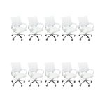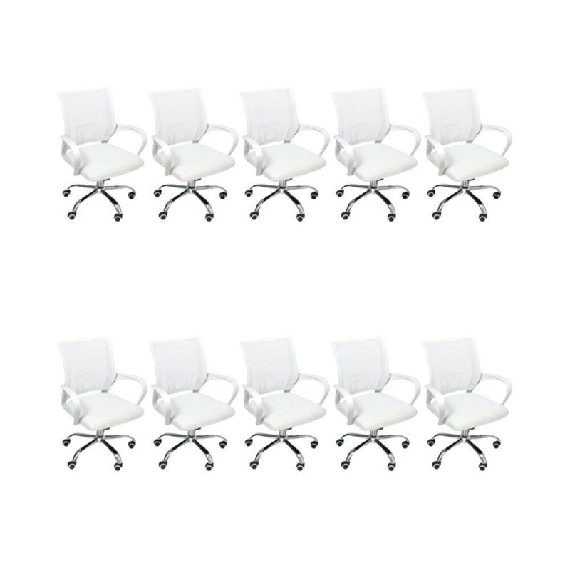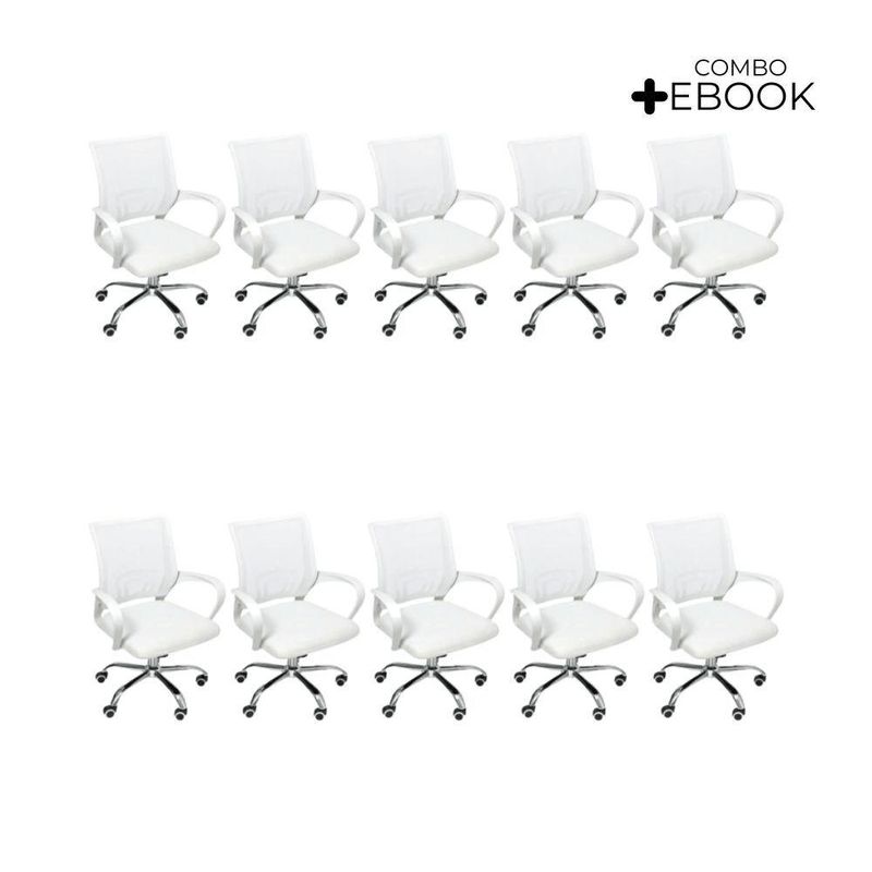 Kit 10 Cadeiras De Escritório Oficial Begonia Tela Mesh Ergonômica BrancoCadeira De Escritório Tela Mesh Begonia Ergonômica GiratóriaA escolha de uma cadeira adequada desempenha um papel crucial na prevenção de possíveis lesões. Com a cadeira Begônia, você garante o conforto e bem-estar essenciais para suas atividades diárias. Além disso, sua versatilidade permite que ela se encaixe perfeitamente em diversos ambientes, seja em casa, no escritório ou home office, proporcionando um toque moderno e harmonioso.Personalização para seu confortoAproveite ao máximo o ajuste de altura desta cadeira. Isso lhe permitirá adaptar a posição do seu tronco em relação à mesa, proporcionando um nível de conforto específico para suas necessidades individuais.Promovendo o bem-estarOs apoios de braço foram cuidadosamente projetados para melhorar sua postura enquanto escreve, facilitando a incorporação natural quando necessário.Mobilidade sem esforçoAs rodas integradas garantem facilidade de movimento em seu espaço. Você não só poderá movê-la com tranquilidade, mas também desfrutará da conveniência das rotações de 360º, eliminando a necessidade de reajustar sua posição ou deslocar-se fisicamente. Escolha a cadeira Begônia para elevar seu conforto e eficiência, enquanto cuida do seu corpo e do seu ambiente de trabalho, estudo ou lazer.AlturaTotal: 100-90 cmBraço até o chão: 75-63 cmAssento até o chão: 58-46 cmEncosto: 48 cmBraço: 28 cmLargura1 Perna: 25 cm2 Pernas: 50 cmAssento: 45 cmEncosto: 40,5 cmBraço: 4,5 cmDe um braço ao outro: 54 cmComprimentoEncosto: 2 cmAssento: 47,5 cmBraço: 30 cmPeso: 5,5 kgEstrutura: Nylon e aço cromadoRevestimento: Nylon, Tela MeshBraço: PolipropilenoAssento: Madeira multilaminadaPeso máximo recomendado: 120 KgAcompanha E-book Exclusivo!