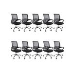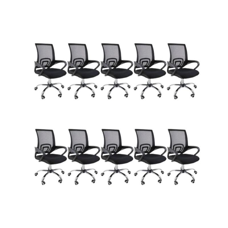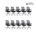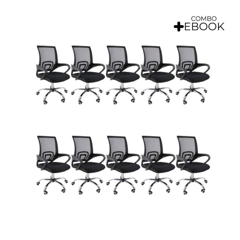 Kit 10 Cadeiras De Escritório Oficial Begonia Tela Mesh Ergonômica PretoCadeira De Escritório Tela Mesh Begonia Ergonômica GiratóriaA escolha de uma cadeira adequada desempenha um papel crucial na prevenção de possíveis lesões. Com a cadeira Begônia, você garante o conforto e bem-estar essenciais para suas atividades diárias. Além disso, sua versatilidade permite que ela se encaixe perfeitamente em diversos ambientes, seja em casa, no escritório ou home office, proporcionando um toque moderno e harmonioso.Personalização para seu confortoAproveite ao máximo o ajuste de altura desta cadeira. Isso lhe permitirá adaptar a posição do seu tronco em relação à mesa, proporcionando um nível de conforto específico para suas necessidades individuais.Promovendo o bem-estarOs apoios de braço foram cuidadosamente projetados para melhorar sua postura enquanto escreve, facilitando a incorporação natural quando necessário.Mobilidade sem esforçoAs rodas integradas garantem facilidade de movimento em seu espaço. Você não só poderá movê-la com tranquilidade, mas também desfrutará da conveniência das rotações de 360º, eliminando a necessidade de reajustar sua posição ou deslocar-se fisicamente. Escolha a cadeira Begônia para elevar seu conforto e eficiência, enquanto cuida do seu corpo e do seu ambiente de trabalho, estudo ou lazer.AlturaTotal: 100-90 cmBraço até o chão: 75-63 cmAssento até o chão: 58-46 cmEncosto: 48 cmBraço: 28 cmLargura1 Perna: 25 cm2 Pernas: 50 cmAssento: 45 cmEncosto: 40,5 cmBraço: 4,5 cmDe um braço ao outro: 54 cmComprimentoEncosto: 2 cmAssento: 47,5 cmBraço: 30 cmPeso: 5,5 kgEstrutura: Nylon e aço cromadoRevestimento: Nylon, Tela MeshBraço: PolipropilenoAssento: Madeira multilaminadaPeso máximo recomendado: 120 KgAcompanha E-book Exclusivo!