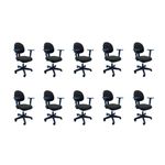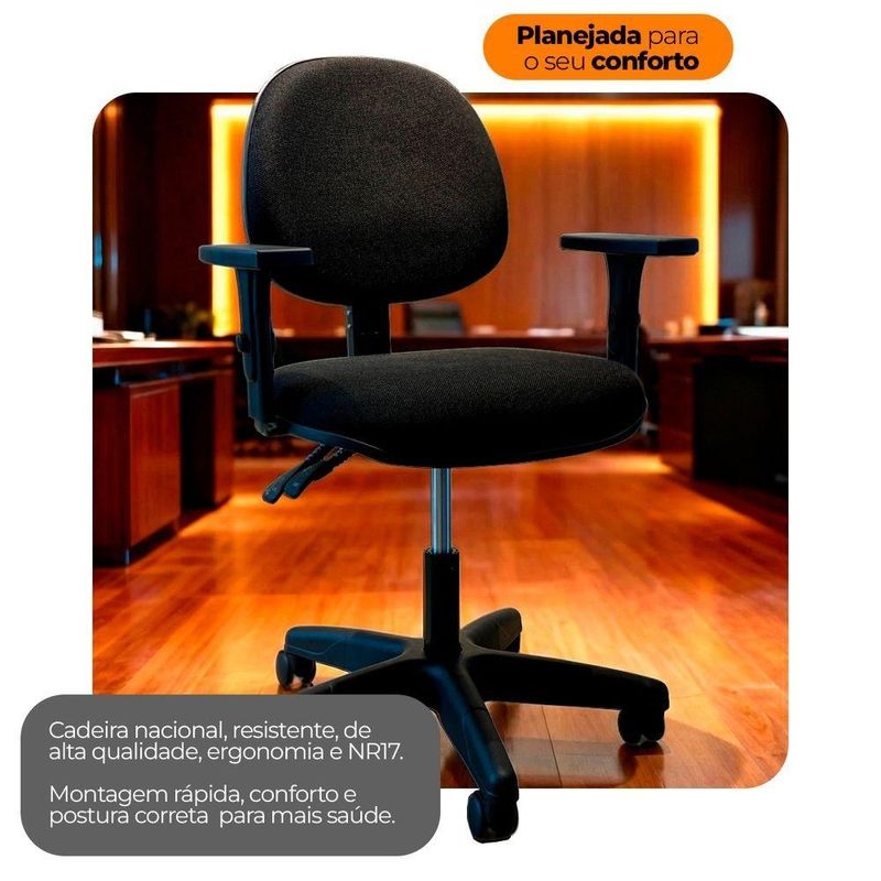 Kit 10 Cadeiras De Escritório Oficial Operativa Cadeira de Escritório Operativa Oficial NR17 – Conforto, Ergonomia e ResistênciaA Cadeira de Escritório Operativa Oficial NR17 foi desenvolvida para oferecer conforto, segurança e desempenho em ambientes corporativos e de home office com alta demanda de uso. Produzida com materiais de excelente qualidade e em conformidade com as normas NR17, ela contribui diretamente para a manutenção da postura correta e para a saúde postural ao longo da jornada de trabalho.Seu assento e encosto são estruturados em compensado anatômico prensado a quente, com lâminas de madeira selecionada de 15 mm de espessura, interligados por aço mola SAE 1045, garantindo maior resistência e durabilidade. As almofadas são moldadas em espuma de poliuretano injetado, proporcionando conforto e melhor distribuição do peso corporal.O sistema Back System permite regulagens precisas de altura e inclinação do encosto, adaptando-se às necessidades do usuário e assegurando ergonomia adequada conforme a NR17. Conta ainda com pistão a gás classe 4, que oferece ajuste de altura suave e seguro, suportando até 120 kg.A base é fabricada em aço carbono com pintura epóxi preta, acompanhada de capa protetora em polipropileno texturizado, conferindo resistência e acabamento moderno. Os rodízios duplos em PP, com duplo giro, garantem deslocamento leve, silencioso e seguro em carpetes e superfícies similares, além de facilitar a limpeza do ambiente.O revestimento em tecido 100% polipropileno é altamente resistente ao desgaste, sendo ideal para locais de uso intenso. Os apoios de braço injetados em polipropileno contam com botão lateral para regulagem de altura, oferecendo mais conforto e apoio aos membros superiores.De fabricação nacional, a cadeira é robusta, confiável e possui montagem simples e rápida, estando pronta para uso em poucos minutos. Seu design giratório permite movimentação em 360°, facilitando o deslocamento sem a necessidade de esforço ou mudança de posição.Acompanha E-book! Dimensões e Especificações Técnicas:Largura do assento:Profundidade do assento:Largura do encosto: 40 cmLargura de um braço ao outro: 60 cmAltura do braço: 23-30 cmDistância entre os pés: 60 cmComprimento: 49 cmLargura do braço: 8 cmAltura mínima do assento ao chão: 39 cmAltura máxima do assento ao chão: 51 cmPeso máximo suportado: 120 kg