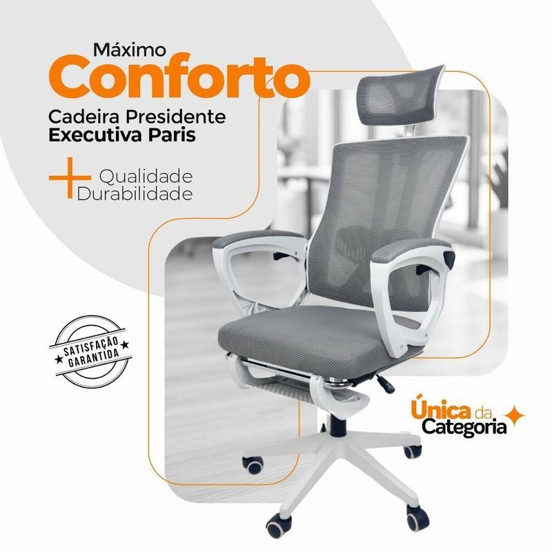 Kit 10 Cadeiras De Escritório Presidente Oficial Paris Cinza 10Cadeira Presidente Paris - Conforto e Sofisticação para o Seu EscritórioA Cadeira Presidente Paris é a combinação perfeita entre design sofisticado e conforto ergonômico. Desenvolvida para proporcionar bem-estar durante longas jornadas de trabalho, ela traz recursos modernos e funcionais que garantem uma postura adequada e conforto excepcional.Ideal para escritórios, home office e ambientes corporativos, a Cadeira Presidente Paris agrega elegância e qualidade ao seu espaço. Diferenciais do Produto: Design Sofisticado e Funcional: Linha Presidencial com visual moderno e elegante. Conforto Ergonômico: Encosto ajustável e apoio de cabeça regulável para suporte adequado. Versatilidade e Praticidade: Giratória, com altura ajustável e apoio para os pés retrátil. Resistência e Durabilidade: Estrutura robusta em polipropileno e acabamento em tela Mesh, garantindo ventilação e conforto. Apoio Lombar Ajustável: Cuida da postura e garante o conforto prolongado. Fácil Movimentação: Rodas de alta qualidade para deslocamento suave.Extras: acompanha e-book exclusivo.Especificações Técnicas:Modelo: ParisMarca: OficialLinha: PresidencialTipo de Cadeira: PresidenteMaterial da Estrutura: Polipropileno / Tela MeshMaterial do Enchimento: Espuma D33Acabamento da Estrutura: Tela MeshPeso Máximo Suportado: 120 kgRecursos e Funcionalidades:Ergonômico: SimGiratório: SimAjuste de Altura: SimApoio de Braços: Sim (fixo)Apoio Lombar: AjustávelApoio de Cabeça: AjustávelApoio para os Pés: SimEncosto Reclinável: Sim (mecanismo Back System)Rodas: SimDimensões do Produto:Altura Mínima (chão ao assento): 42 cmAltura Máxima (chão ao assento): 53 cmAltura do Encosto: 59 cmAltura Mínima da Cadeira (com encosto de cabeça): 116 cmAltura Máxima da Cadeira (com encosto de cabeça): 127 cmProfundidade do Assento: 49 cmProfundidade Total: 49 cmLargura do Assento: 47 cmLargura do Encosto: 43 cmLargura do Assento entre Braços: 47 cmLargura do Assento (braços externos): 59 cmDistância dos Pés: 59 cmComprimento do Apoio para os Pés: 46 cmAltura do Apoio para os Pés: 19 cmLargura do Apoio para os Pés: 35 cmCuidados e Manutenção:A limpeza pode ser realizada com um pano úmido e detergente neutro, preservando a estrutura e o acabamento em tela Mesh, garantindo a durabilidade e a elegância da cadeira.Eleve o Conforto e o Estilo do Seu Ambiente!Invista na Cadeira Presidente Paris e transforme seu escritório com um toque de sofisticação e conforto incomparável. Adquira sua agora e aproveite o melhor em ergonomia e qualidade!