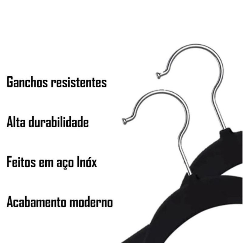 Kit 10 Unidades Cabides Slim Adulto Veludo Preto 42cmKit 10 Unidades Cabides Slim Adulto Veludo Preto 42cmSolução ideal para organizar seu guarda-roupa com elegância e praticidade. Com design ultrafino e acabamento aveludado, esses cabides garantem que suas roupas fiquem sempre no lugar, evitando que escorreguem e amassando menos os tecidos. Fabricados em material resistente, esses cabides suportam diversos tipos de peças, desde camisetas e blusas leves até casacos mais pesados. O gancho metálico giratório facilita o manuseio, permitindo que você ajuste a posição das roupas conforme necessário, estrutura slim que economiza espaço no armário, permitindo armazenar mais peças de forma organizada, revestimento em veludo antiderrapante que evita que as roupas deslizem e caiam, material leve e resistente, adequado para diferentes tipos de tecidos, incluindo seda, algodão, lã e sintéticos, gancho giratório metálico que facilita o acesso e a disposição das roupas no cabideiro, ideal para otimizar a organização do guarda-roupa, trazendo mais praticidade ao dia a dia- Feito especialmente para roupas mais delicadas- Cabides com hastes em aço cromado- Design ultrafino, maximiza o espaço no armário- Com textura totalmente em veludo bege- Curvas delicadas que conservam o formato das roupas- Por terem a textura aveludada, as roupas não escorregam- Cabides com hastes em aço cromado- Material: Plástico revestido com veludo flocado e gancho de metal cromado- Dimensão: Comprimento 42cm, Altura 22,5cm e Espessura 5mm- Cor: Preto- Peso aprox: 600grContém; 01 Kit 10 Unidades Cabides Slim Veludo Preto