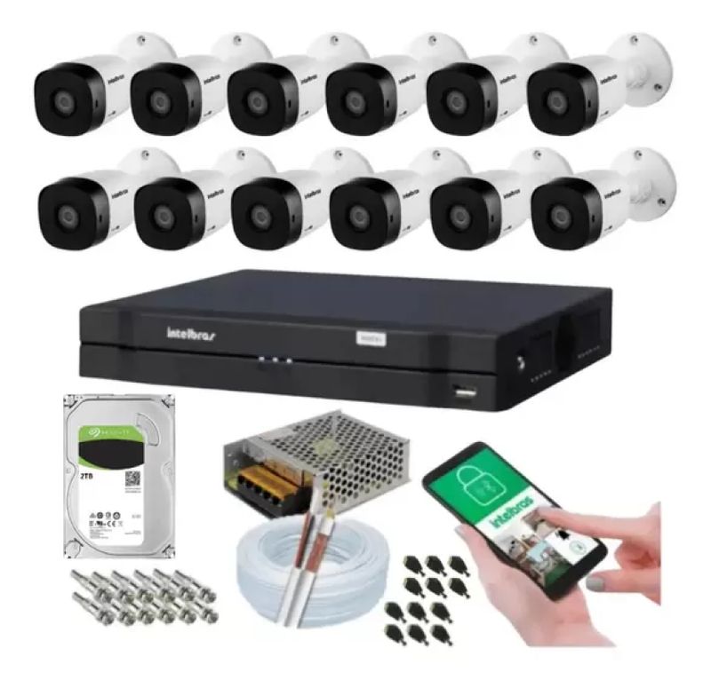 Todos acessórios que precisam para filmar e gravar estão inclusos nesse kit. A tranquilidade que faltava no seu dia-a-dia, dentro ou fora de casa ou do seu negócio. Acesse e monitore as imagens da sua casa ou empresa remotamente, via celular, computador ou tablet. Itens Inclusos: 12 Câmeras 1120 Bullet Intelbras alcance de 20 metros 01 Dvr 16 Canais Mhdx 1116 H.265 Intelbras 01 HD 2000 GB(2TB) 01 Rolo de cabo coaxial 4mm bipolar 80% de malha (100 metros) 01 Fonte 12v eletrônica 10A 01 Fonte 12v eletrônica 05A 12 Conectores P4 Macho 24 Conectores BNC Macho Instalação: Para configurar seu DVR online você precisa somente baixar o APP ISIC LITE, na loja de APPs do deu Smartphone. Após concluída a instalação, basta ler o código QR acima do dvr e digitar no APP a senha que você cadastrou. Pronto seu acesso remoto estará pronto para uso. Custo Benefício Garantido: A linha de câmeras de segurança infravermelho de até 20 metros foi desenvolvida para atender os projetos de CFTV que buscam preço atrativo e qualidade de imagem. Imagens em alta resolução e Compressão de vídeo H.265+ Esse Kit proporciona captura de imagens com resolução de 1280x720p (HD) ideal para ter imagens com qualidade, nitidez e reprodução de cores e O novo codec de vídeo H.265 (também chamado de HEVC ? codificação de vídeo de alta eficiência, na sigla em inglês), é mais eficiente que o seu antecessor H.264.