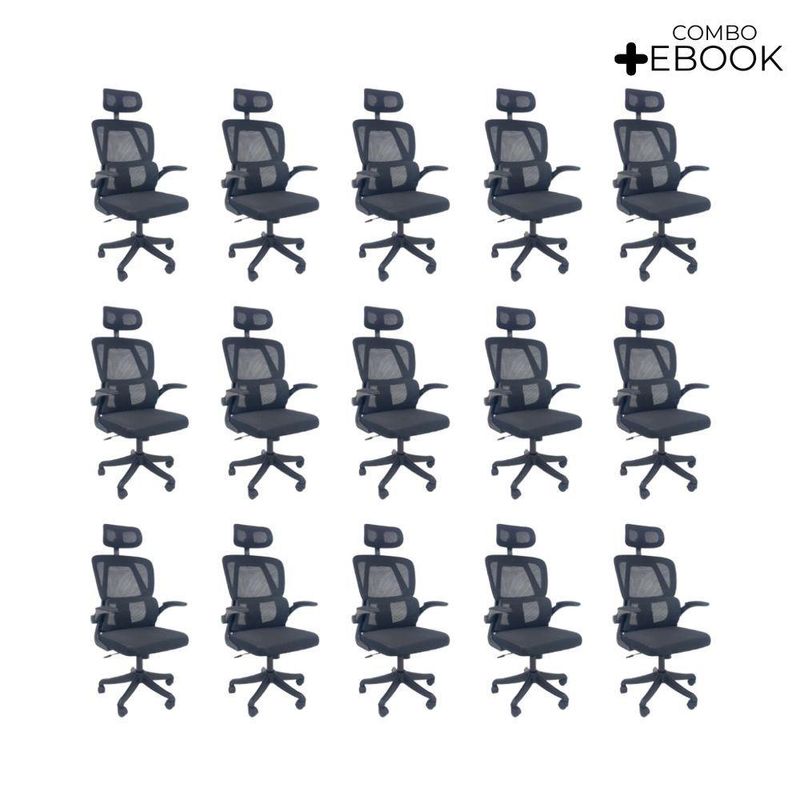 Kit 15 Cadeiras De Escritório Oficial Legacy PretoCadeira Presidente Legacy - Elegância, Conforto e FuncionalidadeA Cadeira Presidente Legacy é a combinação perfeita de conforto e estilo para o seu ambiente de trabalho. Projetada para proporcionar ergonomia, bem-estar e conforto durante longas jornadas, ela se destaca pela robustez, qualidade dos materiais e acabamento sofisticado.Com estrutura resistente e acabamento em Tela Mesh, a Legacy garante ventilação, conforto e durabilidade, além de um design moderno que valoriza qualquer espaço corporativo ou home office. Diferenciais do Produto:Design Executivo e Sofisticado: A combinação de modernidade e elegância para seu escritório.Ergonomia Garantida: Apoio lombar fixo que proporciona uma postura confortável e saudável.Mobilidade Prática: Sistema giratório com rodas de alta qualidade e altura ajustável.Apoio de Cabeça Ajustável: Permite um suporte cervical confortável para uso prolongado.Apoio de Braços Móvel: Flexibilidade para ajustar conforme a necessidade.Reclinação Confortável: Sistema Relax que permite inclinação suave e natural.Estrutura Resistente: Feita em Polipropileno com Tela Mesh, oferecendo durabilidade e ventilação.Extras: acompanha e-book exclusivo. Especificações Técnicas:Modelo: LegacyMarca: Oficial WebshopLinha: PresidencialTipo de Cadeira: PresidenteMaterial da Estrutura: Polipropileno / Tela MeshMaterial do Enchimento: Espuma D33Acabamento da Estrutura: Tela MeshPeso Máximo Suportado: 120 kg Recursos e Funcionalidades:Ergonômica: SimGiratório: SimAjuste de Altura: SimApoio de Braços: Sim (móvel)Apoio Lombar: FixoApoio de Cabeça: Sim (ajustável)Encosto Reclinável: Sim (mecanismo Relax)Rodas: SimApoio para os Pés: Não Dimensões do Produto:Altura Mínima (chão ao assento): 44 cmAltura Máxima (chão ao assento): 54 cmAltura do Encosto: 52 cmAltura Mínima da Cadeira (com encosto de cabeça): 118 cmAltura Máxima da Cadeira (com encosto de cabeça): 132 cmProfundidade do Assento: 43 cmProfundidade Total da Cadeira: 43 cmLargura do Assento: 48 cmLargura do Encosto: 48 cmLargura do Assento entre Braços: 48 cmLargura do Assento (braços externos): 60 cmDistância dos Pés: 37 cm Cuidados e Manutenção:Para manter a sua Cadeira Presidente Legacy sempre impecável, basta utilizar um pano úmido com detergente neutro. A manutenção regular garante a preservação do acabamento e a durabilidade do produto. Conforto e Estilo no seu Escritório!Transforme seu ambiente de trabalho com a Cadeira Presidente Legacy e aproveite o máximo de conforto, funcionalidade e sofisticação. Garanta já a sua e melhore sua produtividade com um design ergonômico e moderno!