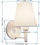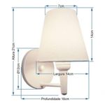 Kit/2 Arandela Cone Md-2004 Base Preto Cúpula Em Tecido 14/14x07cm Preto - BivoltKit/2 Arandela de parede Cone Md-2004 Base Preta Cúpula em Tecido 14/14x07cm PretoAs arandelas Lustres Vivare são elementos versáteis e elegantes que podem transformar qualquer ambiente em um espaço cheio de estilo. Seja para adicionar uma iluminação suave, destacar uma parede ou criar um efeito de luz diferenciado.Cúpula em Tecido: 14x07x14cmArandela de parede Montada: Altura 21cm Largura 14cm Profundidade 16cmFormato: ConeTamanho: PequenoEspecificação:Material: Cúpula em TecidoEstrutura em AlumínioBase Parede: Diâmetro 11x1,2cmResistente: Á MaresiaVoltagem: 110V/220VLiga e Desliga: NãoTipo de Soquete: E27Lâmpada Utilizada: Led Bulbo Até 16w ou Fluorescente Espiral Até 25w CadaCapacidade de Lâmpadas: 1Observação:Acompanha Lâmpada: NãoPossui Led Integrado: NãoGarantia: 12 MesesManual de Instalação: SimArandela de parede Montada: SimControle de Luminosidade: NãoTipo de Embalagem: CaixaConservação e Manutenção do Produto:A Limpeza deve ser realizada com o produto desligado. Remova o lustre que pode ser lavado com sabão neutro. Nunca utilize produtos químicos e abrasivosDica:Antes de comprar o seu produto verifique as medidas, o local onde pretende instalar e se necessário o serviço de um profissional qualificado.