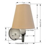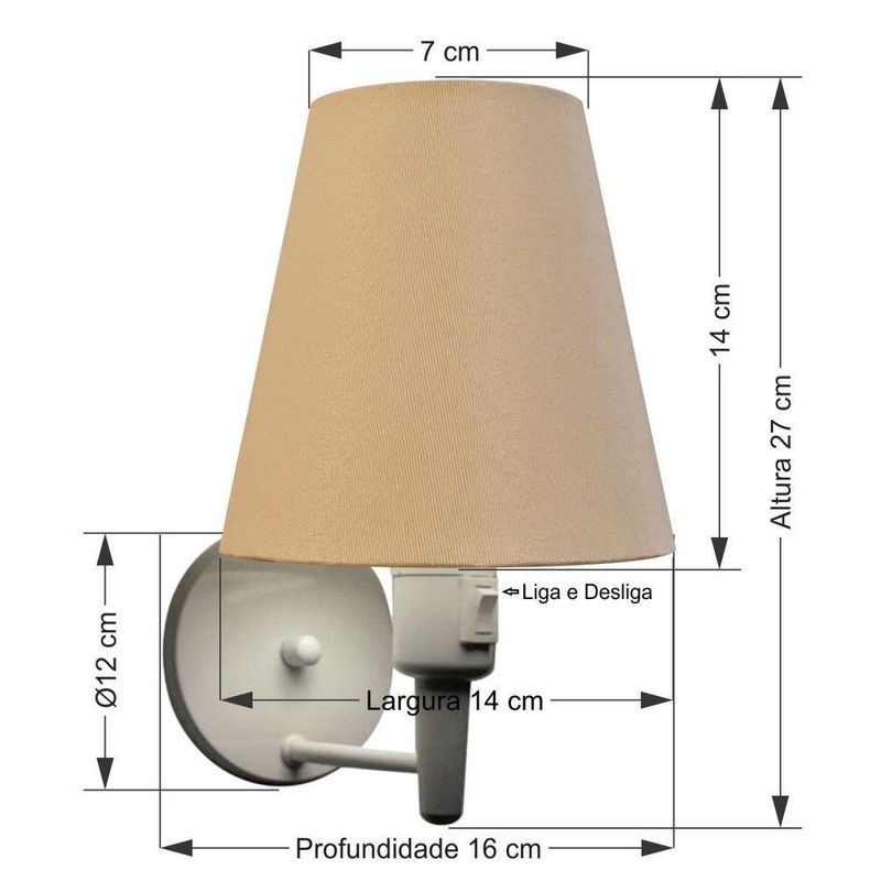 Kit/2 Arandela Cone Md-2013 Branco C/ Inter Liga E Desl Cúpula Em Tecido Palha - BivoltKit/2 Arandela de parede Cone Md-2013 Branca C/ Inter Liga e Desl Cúpula Tecido PalhaAs arandelas Lustres Vivare são elementos versáteis e elegantes que podem transformar qualquer ambiente em um espaço cheio de estilo. Seja para adicionar uma iluminação suave, destacar uma parede ou criar um efeito de luz diferenciado.Dimensão:Cúpula em Tecido: 14x07x14cmArandela de parede Montada: Altura 27cm Largura 14cm Profundidade 16cmFormato: ConeTamanho: PequenoEspecificação:Material: Cúpula em TecidoEstrutura em AlumínioBase Parede: Diâmetro 11x1,2cmResistente: Á MaresiaVoltagem: 110V/220VLiga e Desliga: Interruptor no SoqueteTipo de Soquete: E27Tipo de Lâmpada: Led Bulbo até 16w ou Fluorescente Espiral até 25w CadaCapacidade de Lâmpadas: 1Observação:Acompanha Lâmpada: NãoPossui Led Integrado: NãoGarantia: 12 MesesManual de Instalação: SimArandela de parede Montada: SimControle de Luminosidade: NãoTipo de Embalagem: CaixaConservação e Manutenção do Produto:A Limpeza deve ser realizada com o produto desligado. Remova o lustre que pode ser lavado com sabão neutro. Nunca utilize produtos químicos e abrasivosAntes de comprar o seu produto verifique as medidas, o local onde pretende instalar e se necessário o serviço de um profissional qualificado.