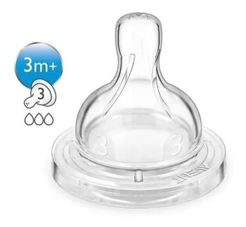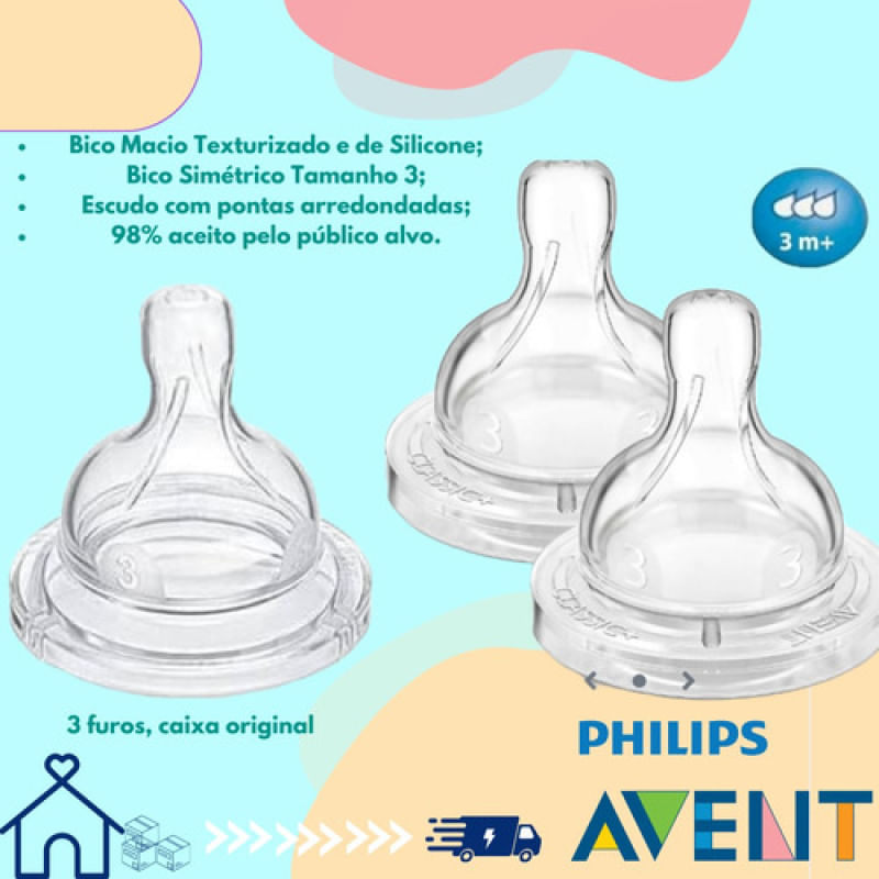 Tenha tranquilidade de comprar com quem esta disposto a te oferecer o melhor atendimento, caso tenha alguma problema após a compra, conte com nossa equipe de pós venda para solucioná-lo!A Feccomerce tem a missão de garantir a satisfação total do seu cliente, tanto nos produtos quanto no atendimento. Assim estabelecendo uma relação de confiança e satisfação. Nossos produtos são 100% originais, lacrados como vem do fabricante.__________________________________Chegou o novo bico para mamadeiras avent da Philips.Apresenta fluxo médio, recomendado nessa faixa de idade e gerando menos desconforto pós alimentação para o bebê. Venha oferecer o melhor para os pequenos!_________________________Especificações Técnicas:- Marca: Philips Avent- Idade Recomendada: A partir do 3 mês de vida- Composição: 100% Silicone- Tamanho 3- Fluxo MédioCompatível com modelo: Mamadeira Clássica AventQuantidade: 2 unidadesMaterial do bico: Silicone Livre de BPA.Produto Isento de Registro, conforme Resolução Nº10, de 21/10/1999, da ANVISA. Produto de acordo com NBR 13.793.Inmetro: OCP 0040 Compulsório."O ministério da saúde adverte: A criança que mama no peito não necessita de mamadeira, bico ou chupeta. O uso de mamadeira, bico ou chupeta prejudica o aleitamento materno."________________________________________________PERGUNTAS FREQUENTES:º Este bico contém 3 furos?R: Sim possui três furos.º Eu consigo usar esse bico na mamadeira avant do bico da pétala ? Quero troca o bico por esse e não sei se encaixa nessa mamadeira.R: Não, os bicos clássicos funcionam apenas em mamadeiras da linha clássica.____________________________________________A empresa Feccomerce agradece a sua preferência e aguardamos sua compra!