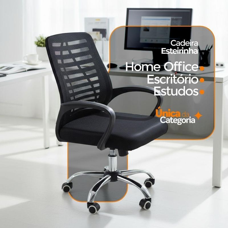 Kit 2 Cadeiras De Escritorio Esteirinha Mesh Ergonomica - PretoCadeira de Escritório Esteirinha Tela Mesh – Conforto, Leveza e Ergonomia para o Dia a DiaA Cadeira Esteirinha Tela Mesh foi desenvolvida para oferecer praticidade, ventilação e conforto para quem passa longas horas sentado. Com design leve, estrutura funcional e recursos essenciais de ergonomia, ela é ideal para escritórios, home office e ambientes de estudo que exigem mobilidade e bem-estar.Seu encosto em tela Mesh respirável garante excelente circulação de ar, reduzindo o acúmulo de calor durante o uso prolongado. O assento possui estrutura resistente em madeira multilaminada e revestimento confortável para tornar sua rotina mais agradável.Com ajuste de altura, sistema giratório e rodízios de movimentação suave, a Esteirinha oferece a versatilidade que o seu dia a dia precisa, ao mesmo tempo em que os apoios de braço fixos contribuem para uma postura mais estável e confortável.Disponível nas cores preta e branca, para combinar com diferentes estilos de ambiente. Conforto, Mobilidade e Ergonomia EssencialEncosto em tela Mesh respirável, proporcionando ventilação contínua.Assento com estrutura resistente e formato ergonômico para maior conforto ao longo do dia.Apoios de braço fixos que auxiliam na postura durante reuniões, atividades de escrita e uso de computador.Sistema giratório com rotação de 360º, oferecendo liberdade de movimento.Regulagem de altura que permite ajustar a postura ideal de acordo com sua mesa de trabalho.Rodízios resistentes e silenciosos, garantindo deslocamento suave no ambiente.Acompanha e-book exclusivo como material adicional. Medidas do ProdutoAlturaTotal: 89–97 cmAssento ao chão: 58–67 cmAltura do encosto: 51 cmAltura do braço: 23 cmLarguraBase 1 perna: 25 cmBase 2 pernas: 50 cmEncosto: 47 cmAssento: 46 cmDistância entre braços: 61 cmLargura do braço: 5 cmComprimentoEspessura do encosto: 2 cmAssento: 45,5 cmBraço: 32 cm Informações TécnicasPeso: 5 kgEstrutura: Nylon e aço cromadoRevestimento: Nylon e tela MeshBraços: PolipropilenoAssento: Madeira multilaminadaPeso máximo suportado: 120 kgCores disponíveis: Preto e Branco Leveza, Funcionalidade e Conforto ao Seu AlcanceA Cadeira Esteirinha Tela Mesh é a escolha ideal para quem busca uma cadeira prática, arejada e confortável para uso diário.Combinando mobilidade, ergonomia e um design versátil, ela se adapta facilmente a diferentes ambientes — sempre entregando bem-estar e desempenho.