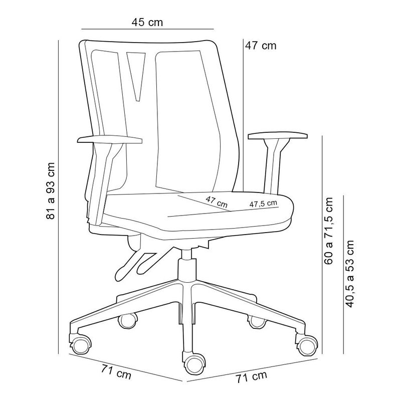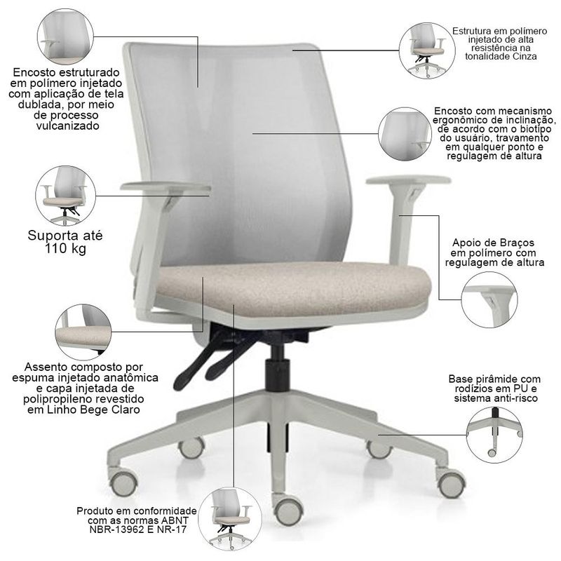 O Kit 02 Cadeiras de Escritório Flow, da Lyam Decor, é a perfeita combinação entre estilo e funcionalidade, ideal para quem busca conforto nas longas horas de trabalho. Com um design moderno e ergonômico, essa cadeira giratória se adapta perfeitamente ao seu biotipo, oferecendo regulagem de altura do assento, encosto e braços. O mecanismo de contato intuitivo permite ajustes precisos, garantindo que cada usuário encontre a posição ideal para manter a produtividade e o bem-estar. Sua base em pirâmide não é apenas elegante, mas também prática, pois conta com rodízios em PU que deslizam suavemente pelo chão, enquanto o sistema anti-risco protege seus pisos contra danos indesejados. Seja no escritório ou em um home office aconchegante, a cadeira diretor Flow transforma qualquer ambiente em um espaço de trabalho ou estudos sofisticado e confortável. Sente-se, ajuste e flua na sua produtividade! Dimensões da Cadeira (L x A x P) 71 x 81 x 71 cm Medidas Internas: Altura máxima regulável: até 93 cm Altura regulável do chão ao assento: 40,5 a 53 cm Altura do chão aos braços: 60 a 71,5 cm Assento livre (L x P): 47,5 x 47 cm Encosto (L x A): 45 x 47 cm Características: Estrutura em polímero injetado de alta resistência na tonalidade Cinza. Assento estruturado em compensado multilaminado e estofado com espuma injetada anatômica, com acabamento feito por capa injetada de polipropileno. Revestimento em tecido Linho de alta qualidade na tonalidade Bege Claro. Encosto estruturado em polímero injetado com aplicação de tela dublada, por meio de processo vulcanizado. Encosto com mecanismo ergonômico de inclinação, de acordo com o biotipo do usuário, travamento em qualquer ponto e regulagem de altura. Braços em polímero com regulagem de altura. Base pirâmide com rodízios em PU e sistema anti-risco. Peso máximo suportado 110 kg, com uso recomendado de 8 horas diária. Produto em conformidade com as normas ABNT NBR-13962 E NR-17. - Por se tratar de estofado as medidas podem ter uma pequena variação de até 3 cm. - A tonalidade do produto real poderá ter ligeira variação devido o lote de tecidos. Observações importantes: - Produto para uso residencial em ambiente interno, não devendo ficar exposto diretamente ao sol, calor e umidade excessivos. - Pode haver alguma diferença de tonalidade entre a imagem e o produto real, por conta do tratamento de imagens e a calibração de cores do seu monitor. - As imagens são meramente ilustrativas, não acompanham objetos de decoração e eletrônicos. - Ao receber a mercadoria, o cliente deve verificar as condições da embalagem, caso haja alguma avaria não assine o comprovante de recebimento e entre em contato com nossa loja para orientações. - Montagem, desmontagem e outras instalações serão de responsabilidade do cliente. Não nos responsabilizamos, no ato da entrega, por subir escadas/elevadores ou pelo transporte por guincho em apartamentos. Eventuais despesas são de responsabilidade do comprador. - Confira as dimensões do produto e certifique-se de que passará normalmente por supostos elevadores, portas, escadas e/ou corredores de sua residência. - Para mais informações, acesse nossa Central de Atendimento.