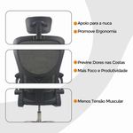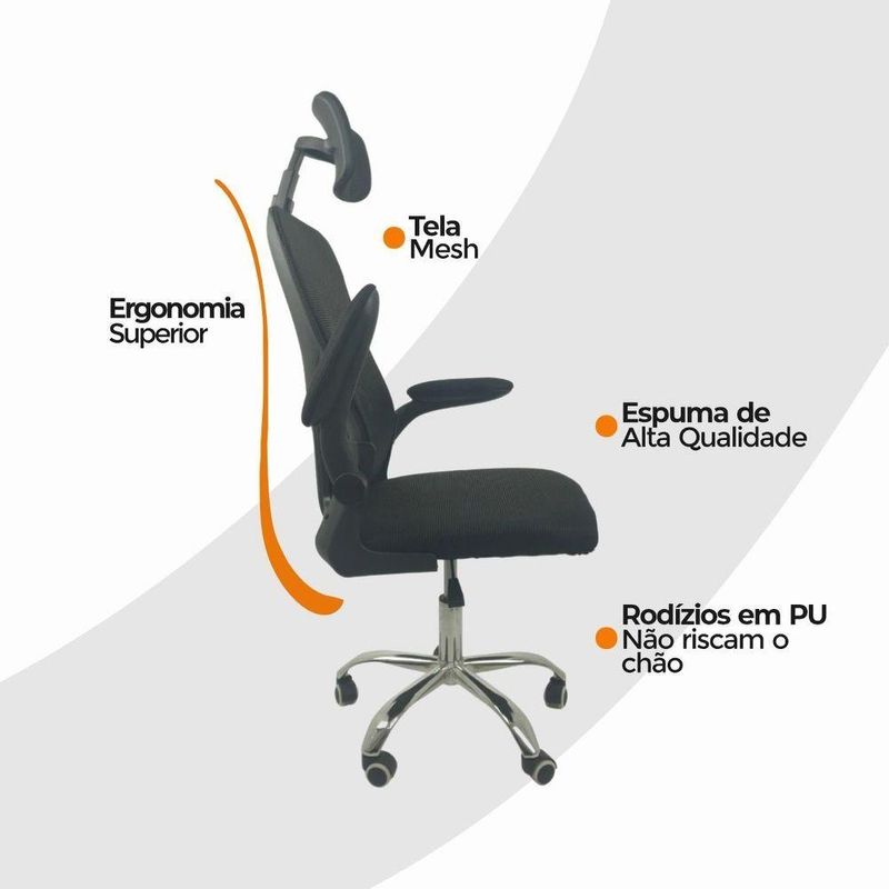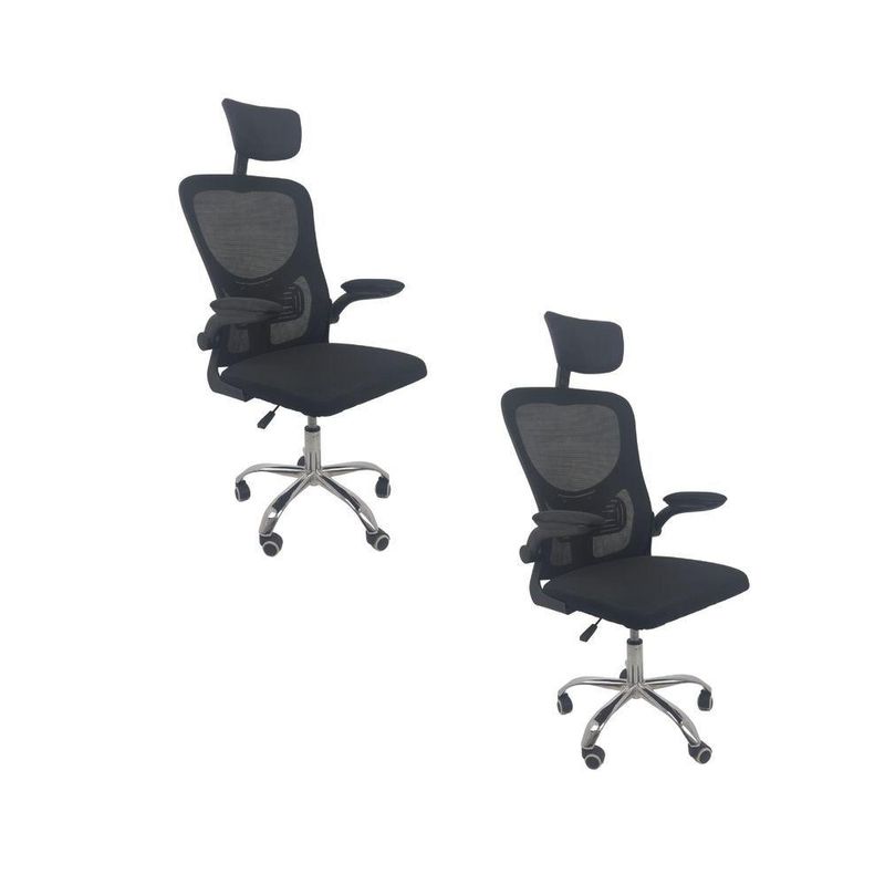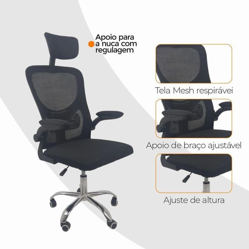 Kit 2 Cadeiras De Escritório Oficial Vegas Apoio PretoCadeira Diretor Vegas – Design, Conforto e Sofisticação para Seu EscritórioA Cadeira Diretor Vegas é a escolha ideal para quem busca elegância, conforto e funcionalidade no ambiente corporativo ou home office. Desenvolvida com design moderno e estrutura resistente, ela oferece suporte ergonômico completo, garantindo bem-estar e produtividade durante longas jornadas de trabalho.Com encosto alto em Tela Mesh respirável, a Vegas proporciona ventilação constante e conforto térmico. Seu sistema de regulagem permite ajustes personalizados, enquanto o acabamento em aço cromado adiciona um toque de sofisticação ao seu espaço de trabalho. Diferenciais do Produto:Design Executivo e Elegante: Combina estilo moderno com acabamento refinado.Encosto Ergonômico: Revestido em tela Mesh respirável, promove conforto e postura adequada.Apoio de Cabeça Ajustável: Suporte cervical para conforto prolongado.Apoio Lombar Integrado: Mantém a postura correta, reduzindo a fadiga.Apoio de Braços Retrátil com Elevação: Versatilidade e praticidade no uso diário.Ajuste de Altura com Pistão a Gás: Personalize a posição ideal de acordo com sua estatura.Base Giratória em Aço Cromado: Alta resistência, durabilidade e um visual sofisticado.Rodas de Nylon Silenciosas: Mobilidade suave e segura em diferentes superfícies.Mecanismo Pneumático de Ajuste: Permite regulagens precisas com facilidade.Extras: Acompanha e-book exclusivo. Especificações Técnicas:Modelo: VegasMarca: Oficial WebshopLinha: DiretorTipo de Cadeira: DiretorMaterial da Estrutura: Aço cromado e polipropileno reforçadoMaterial do Encosto: Tela Mesh respirávelMaterial do Assento: Espuma de alta densidade revestida em tecido poliésterPeso Máximo Suportado: 120 kg Recursos e Funcionalidades:Ergonômica: SimGiratória: SimAjuste de Altura: Sim (pistão a gás)Apoio de Cabeça: Sim (ajustável)Apoio Lombar: SimApoio de Braços: Sim (retrátil e com elevação)Encosto Reclinável: SimRodízios: Sim (nylon silencioso) Dimensões do Produto:Altura Total (mín./máx.): 94 cm a 126 cmAltura do Assento (mín./máx.): 41 cm a 50 cmAltura do Encosto: 60 cmAltura do Encosto de Cabeça: 17 cm (ajustável até 20 cm)Largura do Assento: 46 cmProfundidade do Assento: 48 cmLargura entre Braços: 42 cmLargura Total (braços externos): 68 cmDistância dos Pés: 65 cmCapacidade de Carga: Suporta até 120 kg Cuidados e Manutenção:A limpeza pode ser realizada com pano úmido e detergente neutro. Evite produtos abrasivos para preservar o acabamento cromado e a tela Mesh, garantindo maior durabilidade da cadeira. Sofisticação e Conforto para Seu Escritório!Transforme seu ambiente com a Cadeira Diretor Vegas e desfrute de um design ergonômico, moderno e funcional. Ideal para quem busca um produto que alia conforto, praticidade e elegância no dia a dia de trabalho.