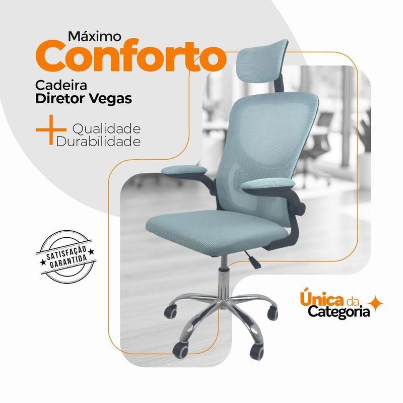 Kit 2 Cadeiras De Escritório Oficial Vegas Com Apoio Azul PretoCadeira Diretor Vegas – Design, Conforto e Sofisticação para Seu EscritórioA Cadeira Diretor Vegas é a escolha ideal para quem busca elegância, conforto e funcionalidade no ambiente corporativo ou home office. Desenvolvida com design moderno e estrutura resistente, ela oferece suporte ergonômico completo, garantindo bem-estar e produtividade durante longas jornadas de trabalho.Com encosto alto em Tela Mesh respirável, a Vegas proporciona ventilação constante e conforto térmico. Seu sistema de regulagem permite ajustes personalizados, enquanto o acabamento em aço cromado adiciona um toque de sofisticação ao seu espaço de trabalho. Diferenciais do Produto:Design Executivo e Elegante: Combina estilo moderno com acabamento refinado.Encosto Ergonômico: Revestido em tela Mesh respirável, promove conforto e postura adequada.Apoio de Cabeça Ajustável: Suporte cervical para conforto prolongado.Apoio Lombar Integrado: Mantém a postura correta, reduzindo a fadiga.Apoio de Braços Retrátil com Elevação: Versatilidade e praticidade no uso diário.Ajuste de Altura com Pistão a Gás: Personalize a posição ideal de acordo com sua estatura.Base Giratória em Aço Cromado: Alta resistência, durabilidade e um visual sofisticado.Rodas de Nylon Silenciosas: Mobilidade suave e segura em diferentes superfícies.Mecanismo Pneumático de Ajuste: Permite regulagens precisas com facilidade.Extras: Acompanha e-book exclusivo. Especificações Técnicas:Modelo: VegasMarca: Oficial WebshopLinha: DiretorTipo de Cadeira: DiretorMaterial da Estrutura: Aço cromado e polipropileno reforçadoMaterial do Encosto: Tela Mesh respirávelMaterial do Assento: Espuma de alta densidade revestida em tecido poliésterPeso Máximo Suportado: 120 kg Recursos e Funcionalidades:Ergonômica: SimGiratória: SimAjuste de Altura: Sim (pistão a gás)Apoio de Cabeça: Sim (ajustável)Apoio Lombar: SimApoio de Braços: Sim (retrátil e com elevação)Encosto Reclinável: SimRodízios: Sim (nylon silencioso) Dimensões do Produto:Altura Total (mín./máx.): 94 cm a 126 cmAltura do Assento (mín./máx.): 41 cm a 50 cmAltura do Encosto: 60 cmAltura do Encosto de Cabeça: 17 cm (ajustável até 20 cm)Largura do Assento: 46 cmProfundidade do Assento: 48 cmLargura entre Braços: 42 cmLargura Total (braços externos): 68 cmDistância dos Pés: 65 cmCapacidade de Carga: Suporta até 120 kg Cuidados e Manutenção:A limpeza pode ser realizada com pano úmido e detergente neutro. Evite produtos abrasivos para preservar o acabamento cromado e a tela Mesh, garantindo maior durabilidade da cadeira. Sofisticação e Conforto para Seu Escritório!Transforme seu ambiente com a Cadeira Diretor Vegas e desfrute de um design ergonômico, moderno e funcional. Ideal para quem busca um produto que alia conforto, praticidade e elegância no dia a dia de trabalho.