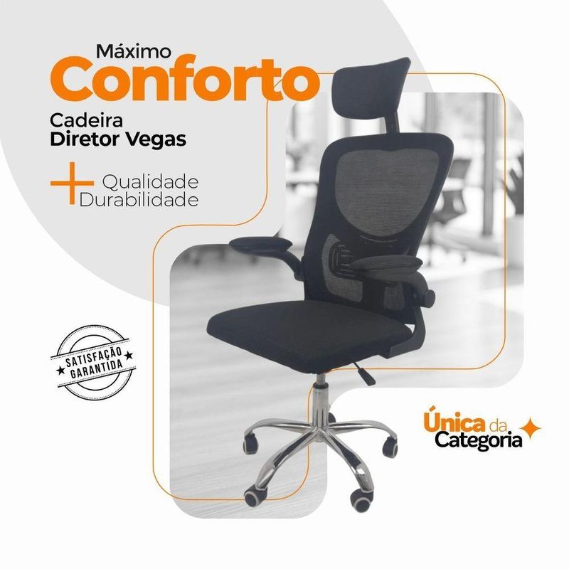 Kit 2 Cadeiras De Escritório Oficial Vegas Com Apoio PretoCadeira Diretor Vegas – Design, Conforto e Sofisticação para Seu EscritórioA Cadeira Diretor Vegas é a escolha ideal para quem busca elegância, conforto e funcionalidade no ambiente corporativo ou home office. Desenvolvida com design moderno e estrutura resistente, ela oferece suporte ergonômico completo, garantindo bem-estar e produtividade durante longas jornadas de trabalho.Com encosto alto em Tela Mesh respirável, a Vegas proporciona ventilação constante e conforto térmico. Seu sistema de regulagem permite ajustes personalizados, enquanto o acabamento em aço cromado adiciona um toque de sofisticação ao seu espaço de trabalho. Diferenciais do Produto:Design Executivo e Elegante: Combina estilo moderno com acabamento refinado.Encosto Ergonômico: Revestido em tela Mesh respirável, promove conforto e postura adequada.Apoio de Cabeça Ajustável: Suporte cervical para conforto prolongado.Apoio Lombar Integrado: Mantém a postura correta, reduzindo a fadiga.Apoio de Braços Retrátil com Elevação: Versatilidade e praticidade no uso diário.Ajuste de Altura com Pistão a Gás: Personalize a posição ideal de acordo com sua estatura.Base Giratória em Aço Cromado: Alta resistência, durabilidade e um visual sofisticado.Rodas de Nylon Silenciosas: Mobilidade suave e segura em diferentes superfícies.Mecanismo Pneumático de Ajuste: Permite regulagens precisas com facilidade.Extras: Acompanha e-book exclusivo. Especificações Técnicas:Modelo: VegasMarca: Oficial WebshopLinha: DiretorTipo de Cadeira: DiretorMaterial da Estrutura: Aço cromado e polipropileno reforçadoMaterial do Encosto: Tela Mesh respirávelMaterial do Assento: Espuma de alta densidade revestida em tecido poliésterPeso Máximo Suportado: 120 kg Recursos e Funcionalidades:Ergonômica: SimGiratória: SimAjuste de Altura: Sim (pistão a gás)Apoio de Cabeça: Sim (ajustável)Apoio Lombar: SimApoio de Braços: Sim (retrátil e com elevação)Encosto Reclinável: SimRodízios: Sim (nylon silencioso) Dimensões do Produto:Altura Total (mín./máx.): 94 cm a 126 cmAltura do Assento (mín./máx.): 41 cm a 50 cmAltura do Encosto: 60 cmAltura do Encosto de Cabeça: 17 cm (ajustável até 20 cm)Largura do Assento: 46 cmProfundidade do Assento: 48 cmLargura entre Braços: 42 cmLargura Total (braços externos): 68 cmDistância dos Pés: 65 cmCapacidade de Carga: Suporta até 120 kg Cuidados e Manutenção:A limpeza pode ser realizada com pano úmido e detergente neutro. Evite produtos abrasivos para preservar o acabamento cromado e a tela Mesh, garantindo maior durabilidade da cadeira. Sofisticação e Conforto para Seu Escritório!Transforme seu ambiente com a Cadeira Diretor Vegas e desfrute de um design ergonômico, moderno e funcional. Ideal para quem busca um produto que alia conforto, praticidade e elegância no dia a dia de trabalho.