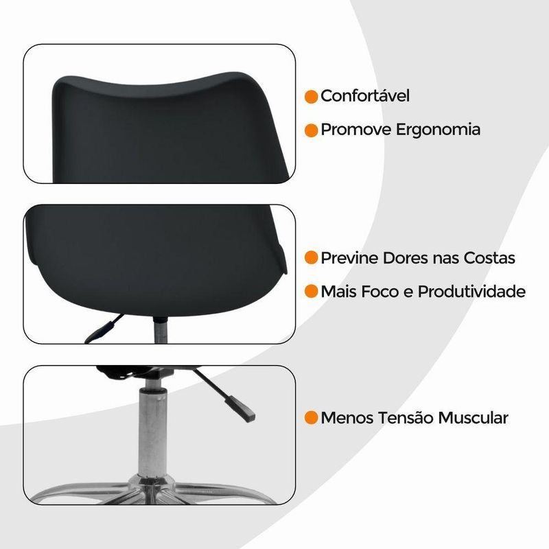 Kit 2 Cadeiras Office Base Cromada Com Rodízio Giratória Saarinen PretoCadeira Office Base Cromada Com Rodizio Giratória SaarinenPara quem busca dar vida e sofisticação ao ambiente e conforto a Cadeira Giratória Saarinen é uma ótima opção. Ela se adapta a qualquer ambiente e é forte tendência em decoração. Projetadas para combinar com qualquer ambiente que você desejar usá-las: para sala de jantar, cozinha, no quarto ou escritório, áreas de lazer, e ambientes comerciais.Aproveite ao máximo o ajuste de altura desta cadeira. Isso lhe permitirá adaptar a posição do seu tronco em relação à mesa, proporcionando um nível de conforto específico para suas necessidades individuais.A Cadeira Giratória Saarinen é feita em polipropileno com assento revestido por material sintético, apresentando uma alta qualidade e excelente acabamento. Ela é versátil, com a altura do assento ajustável. Isso permite que você a regule de acordo com as suas necessidades, o que garante um maior conforto.O modelo conta com uma base giratória cromada e rodinhas. Isso facilita consideravelmente a sua locomoção no ambiente de trabalho. Além disso, a cadeira é muito bonita e elegante, combinando com qualquer ambiente. É uma ótima aquisição que deixará a sua sala de trabalho com uma aparência ainda mais respeitável, além de garantir maior conforto para você. AlturaTotal: 83 - 96 cmAssento até o chão: 60 - 47 cmEncosto: 42 cm Largura1 Perna: 30 cm2 Pernas: 67 cmAssento: 48 cmEncosto: 48 cm ComprimentoEncosto: 2 cmAssento: 41 cmPeso: 6 kgEstrutura: Polipropileno e aço cromadoRevestimento: Couro SintéticoAssento: Madeira multilaminadaPeso máximo recomendado: 120 Kg