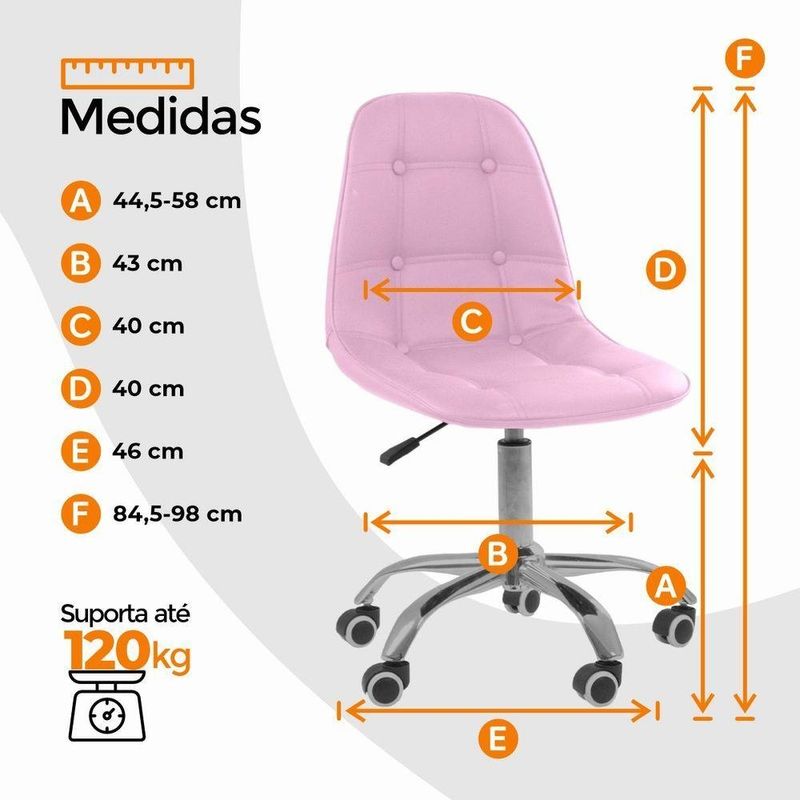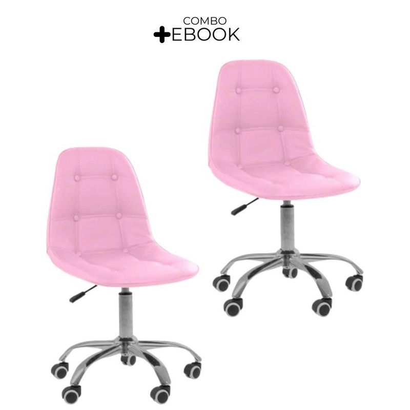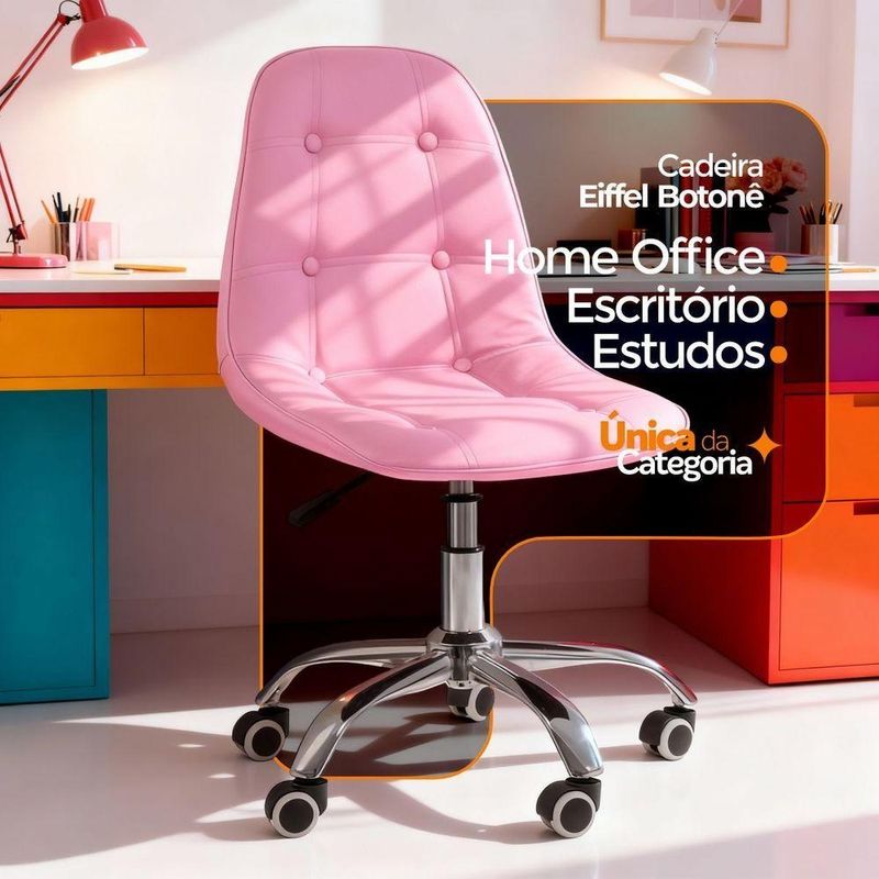 Kit 2 Cadeiras Office Eiffel Botonê Ajustável Oficial RosaCadeira Office Eiffel Botonê Ajustável com Base Giratória – Design, Conforto e Versatilidade para o Seu EspaçoDescubra o equilíbrio ideal entre estilo moderno e conforto ergonômico com a Cadeira Office Eiffel Botonê Ajustável com Base Giratória.Desenvolvida para oferecer elegância e funcionalidade, ela é perfeita para escritórios, home offices, salas de estudo, áreas de lazer e ambientes comerciais.Seu design contemporâneo com estofamento botonê traz um toque sofisticado à decoração, enquanto o assento anatômico e o encosto ergonômico garantem conforto e postura correta mesmo durante longos períodos de uso.Com ajuste de altura e base giratória com rodízios, a Cadeira Eiffel Botonê proporciona mobilidade suave e personalização de uso, adaptando-se facilmente às suas necessidades diárias com praticidade e estilo.A montagem é simples e rápida — acompanha manual de instruções e suporte de atendimento especializado para qualquer dúvida. Diferenciais do ProdutoDesign Sofisticado e Ergonômico: Estilo botonê moderno com curvas anatômicas que garantem conforto e elegância.Ajuste de Altura Personalizado: Permite adaptar a cadeira ao seu biotipo e à altura da mesa.Base Giratória com Rodízios Cromados: Mobilidade fluida e estabilidade em qualquer superfície.Estrutura Resistente e Durável: Produzida em polipropileno (PP) e aço cromado de alta qualidade.Revestimento Premium: Material sintético (PU) de toque suave e fácil limpeza.Versatilidade de Uso: Ideal para ambientes corporativos e residenciais.Montagem Simples: Acompanha manual e suporte pós-venda especializado.Extras: acompanha e-book exclusivo. Especificações TécnicasModelo: Eiffel BotonêMarca: Oficial WebshopTipo de Cadeira: Office / GiratóriaMaterial da Estrutura: Polipropileno (PP) e Aço CromadoRevestimento: Material Sintético (PU)Assento e Encosto: Madeira multilaminada com acabamento botonêBase: Giratória com rodízios e regulagem de alturaPeso Máximo Suportado: 120 kgPeso da Cadeira: 5,5 kg Dimensões do ProdutoAltura Total (mín./máx.): 84,5 cm a 98 cmAltura do Assento (mín./máx.): 44,5 cm a 58 cmAltura do Encosto: 68 cmLargura do Assento: 43 cmProfundidade do Assento: 41 cmLargura da Base (pernas): 47,5 cmEspessura do Encosto: 5 cm Cuidados e ManutençãoLimpe com pano úmido e detergente neutro, evitando produtos abrasivos que possam danificar o acabamento.Evite exposição direta ao sol para preservar a cor, o brilho e a durabilidade do revestimento e da base cromada. Conforto e Estilo em Cada Detalhe!A Cadeira Office Eiffel Botonê Ajustável com Base Giratória combina ergonomia, resistência e elegância em um único design.Ideal para quem busca um ambiente funcional e sofisticado, ela transforma o seu espaço em um local mais confortável, moderno e inspirador.